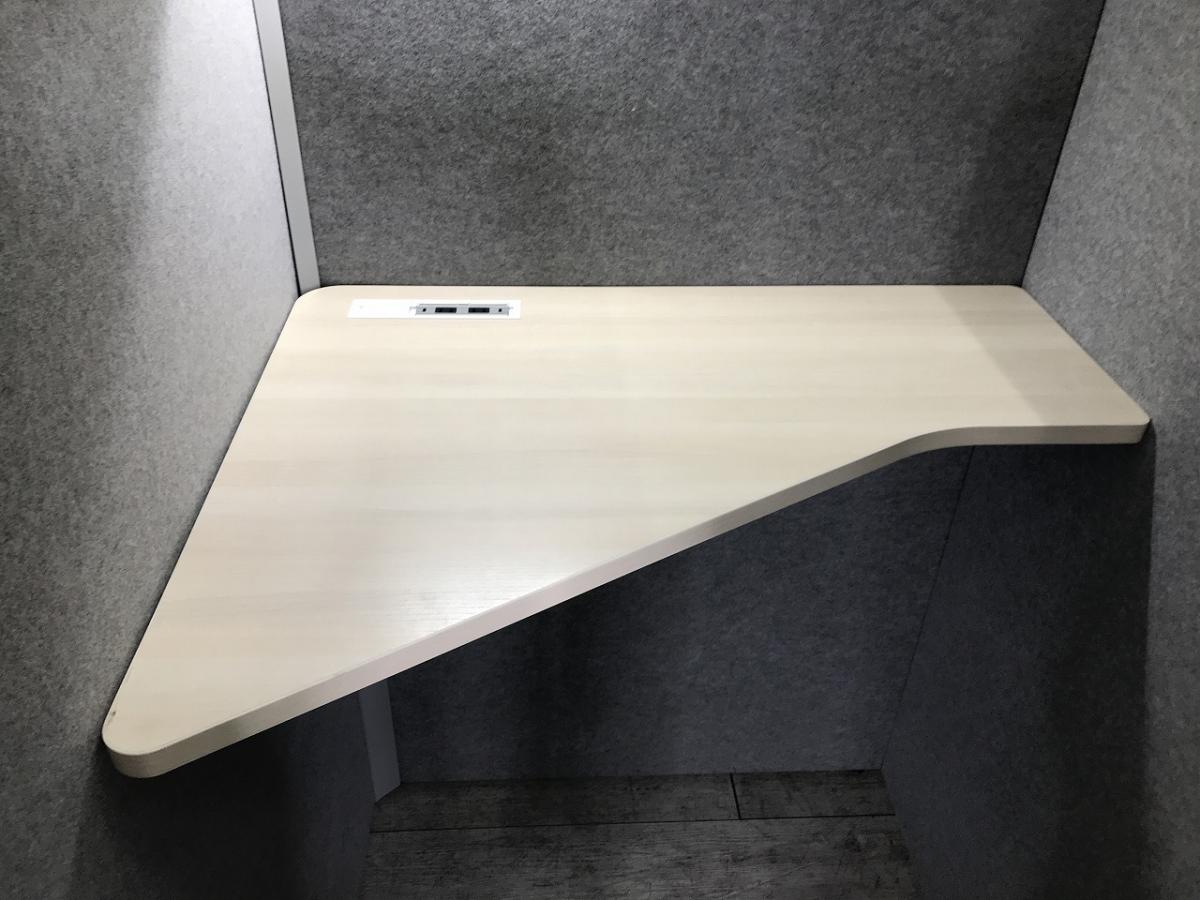 視線がブースの角に向かい、周囲の人の動きが視界に入りにくくなるようにデザインされたワーク天板。