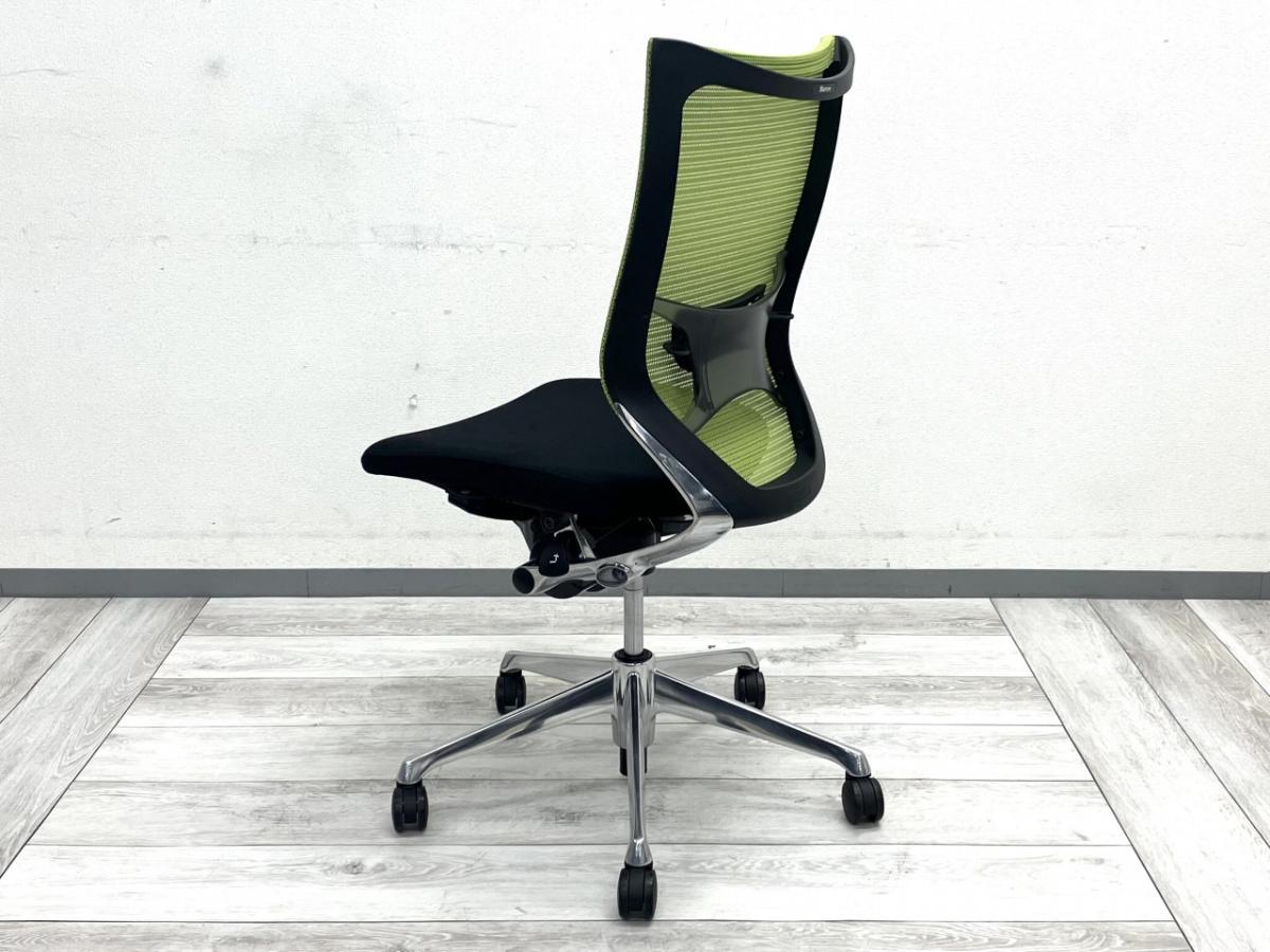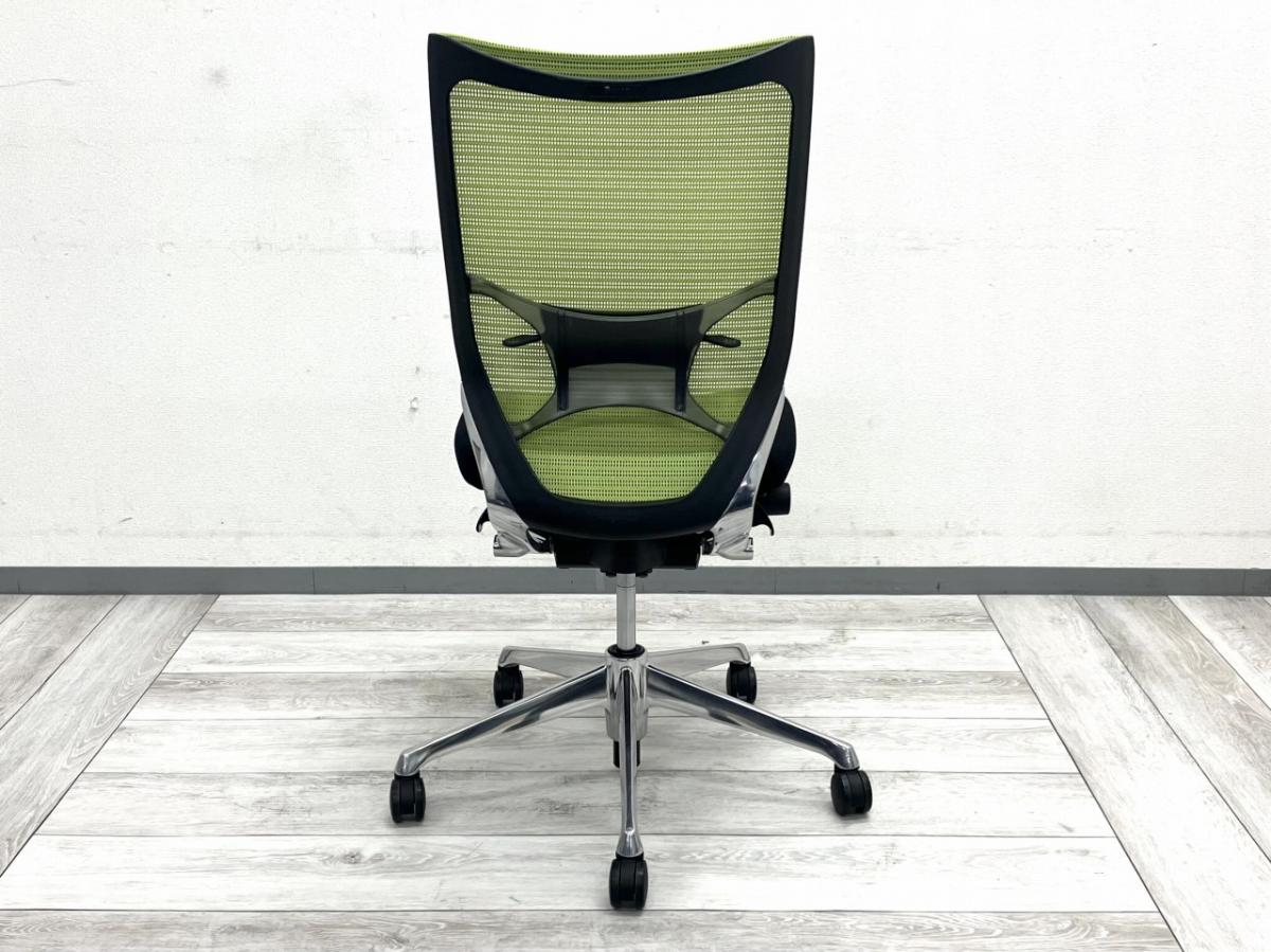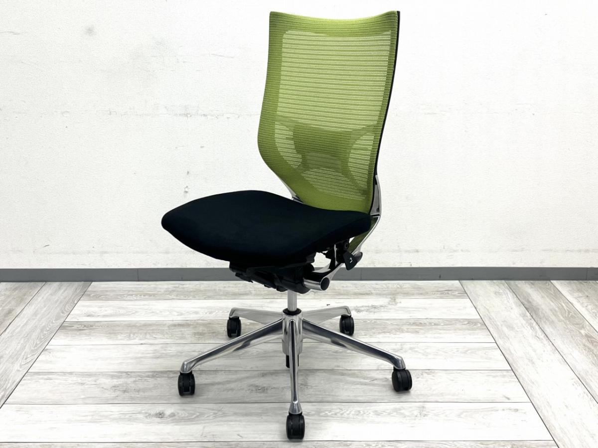 オカムラの人気チェア「バロン(CP35BR)」のハイバックモデル。背面は爽やかなライトグリーンのメッシュ生地で、空間を明るく見せつつ長時間使用でも蒸れにくい快適構造です。座面はブラッククッションで引き締まった印象。さらにランバーサポートも搭載されているため、腰をしっかり支えてくれます。アルミポリッシュ脚が上質さを加え、全体として軽やかで洗練されたデザインが魅力です。