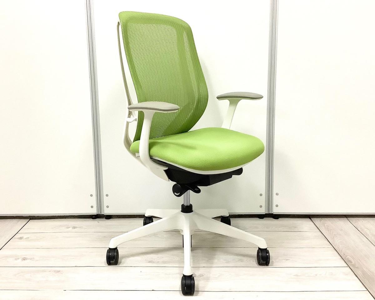 【前傾チルト機能付き!オカムラ製品で最も人気を集める高機能メッシュチェア!】■オカムラ(okamura)製 シルフィ(Sylphy)チェア ハイバック 肘付き ■可動肘 ■ライムグリーン × ホワイトシェル【状態良好品!】