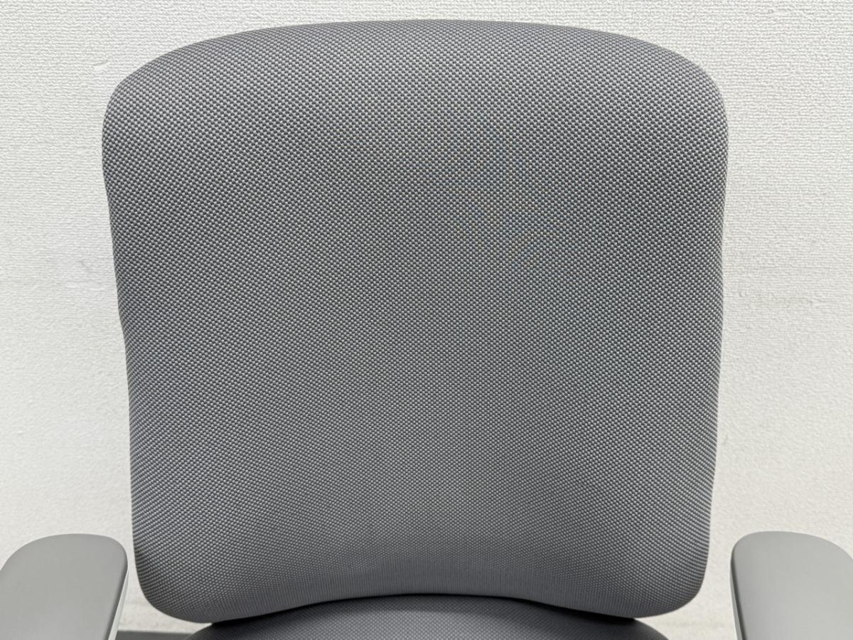 オカムラの現行モデル「スフィア」肘付き・グレーファブリック/ホワイトフレーム。背から座へ自然に続く大きめのカーブが、背骨のS字を保ちながら身体をやさしく受け止めます。可動肘とガス昇降で体格や作業姿勢に合わせやすく、執務スペースにも来客スペースにもなじむ落ち着いた配色です。※2022年製。写真個体の質感は布張りタイプ。