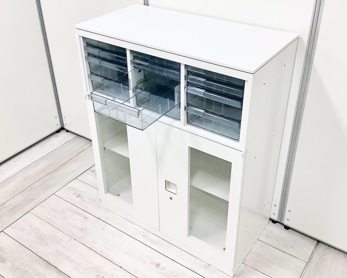 【※一か所引出し割れ有り】【希少なクリスタルキャビネット!細かい書類整理の仕分けに!】■okamura オカムラ クリスタルトレー 浅型24×3列 ■本体ホワイト×ナチュラル天板 〈岐阜・愛知・三重・静岡・福井〉