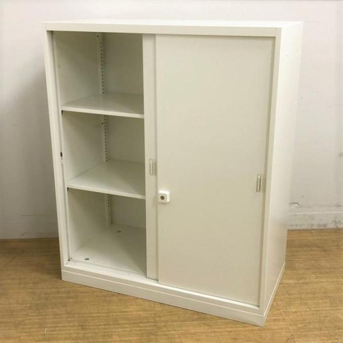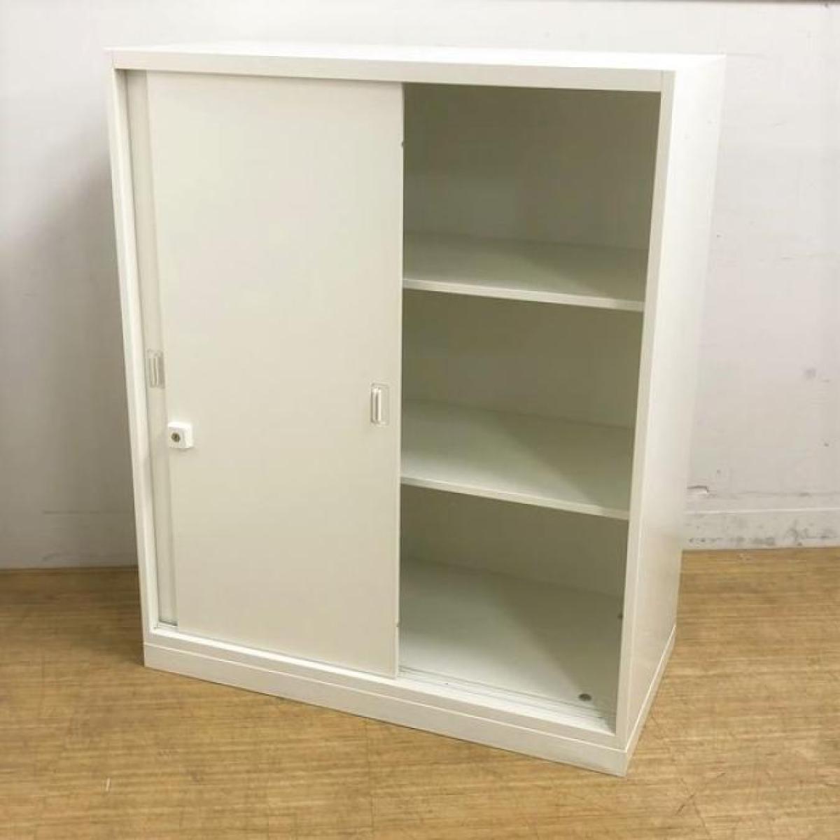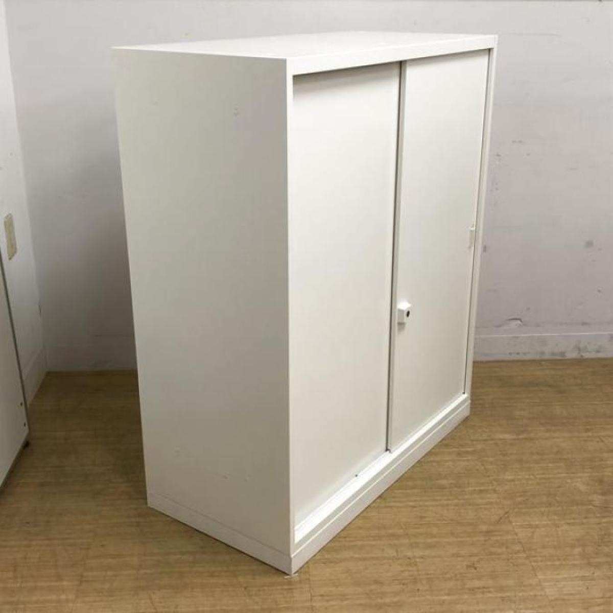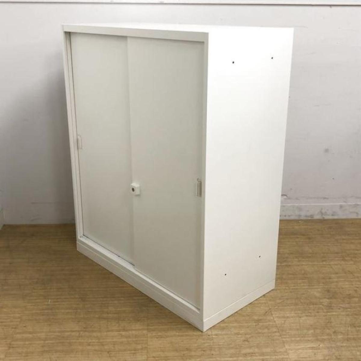 【スライド引き戸だから開閉スペースに困りません!】■オカムラ(okamura)製 レクトラインシリーズ 引違い書庫 2枚引き戸 ローキャビネット ■W900xD450xH1100mm ■ベース付き ■シリンダー錠 ■ホワイト