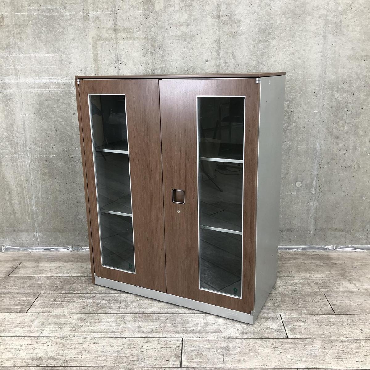 【希少なガラス扉に高級感溢れる木目調ブラウンカラーのレアな両開き書庫が入荷!】■オカムラ(okamura)製 レクトラインシリーズ 両開き書庫 ローキャビネット ■ガラス扉 ■右側木目板付 ■天板・扉:木目ブラウン/側:シルバー