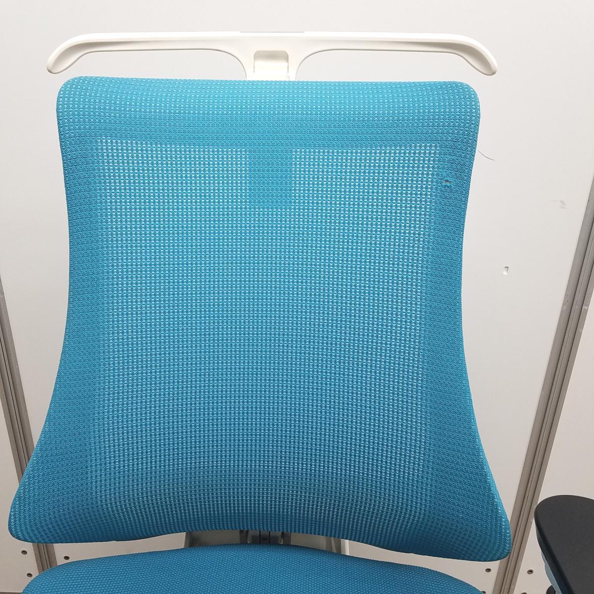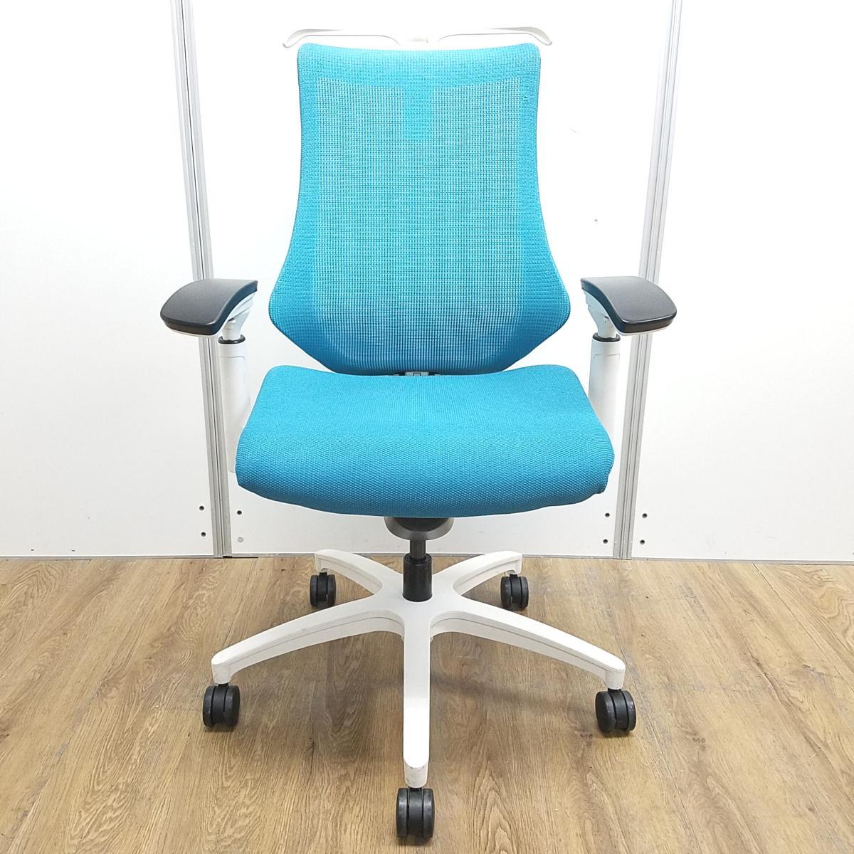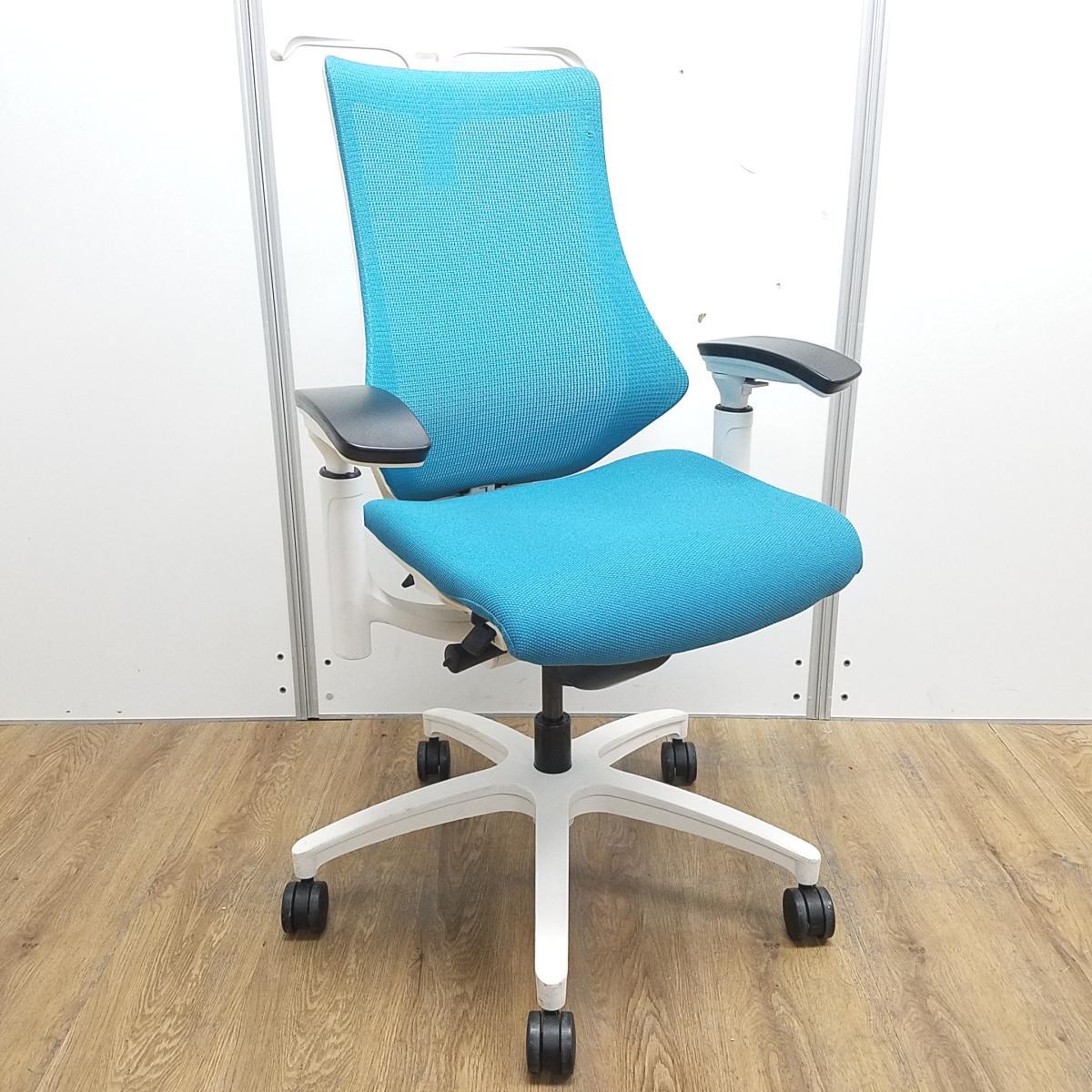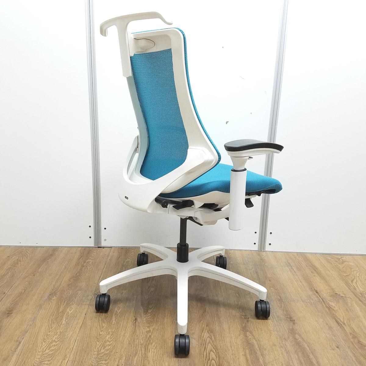 【姿勢の変化にフレキシブルに対応!スタイリッシュで座り心地も抜群な高機能チェア】■イトーキ(ITOKI)製 エフ(f)チェア 肘付き ハイバック 背面メッシュ ■可動肘・ハンガー付 ■ストロングブルー×ホワイトシェル ※日焼け有