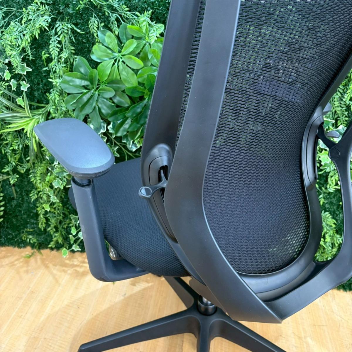 【限定1脚】【三次元曲面が身体にフィット!前傾チルト機能付き大人気メッシュチェア!】■オカムラ(okamura)製 シルフィーチェア(Sylphy) 肘付きハイバック ■背面メッシュ ■可動肘 ■ブラック×ブラックシェル ■ランバーサポート付き