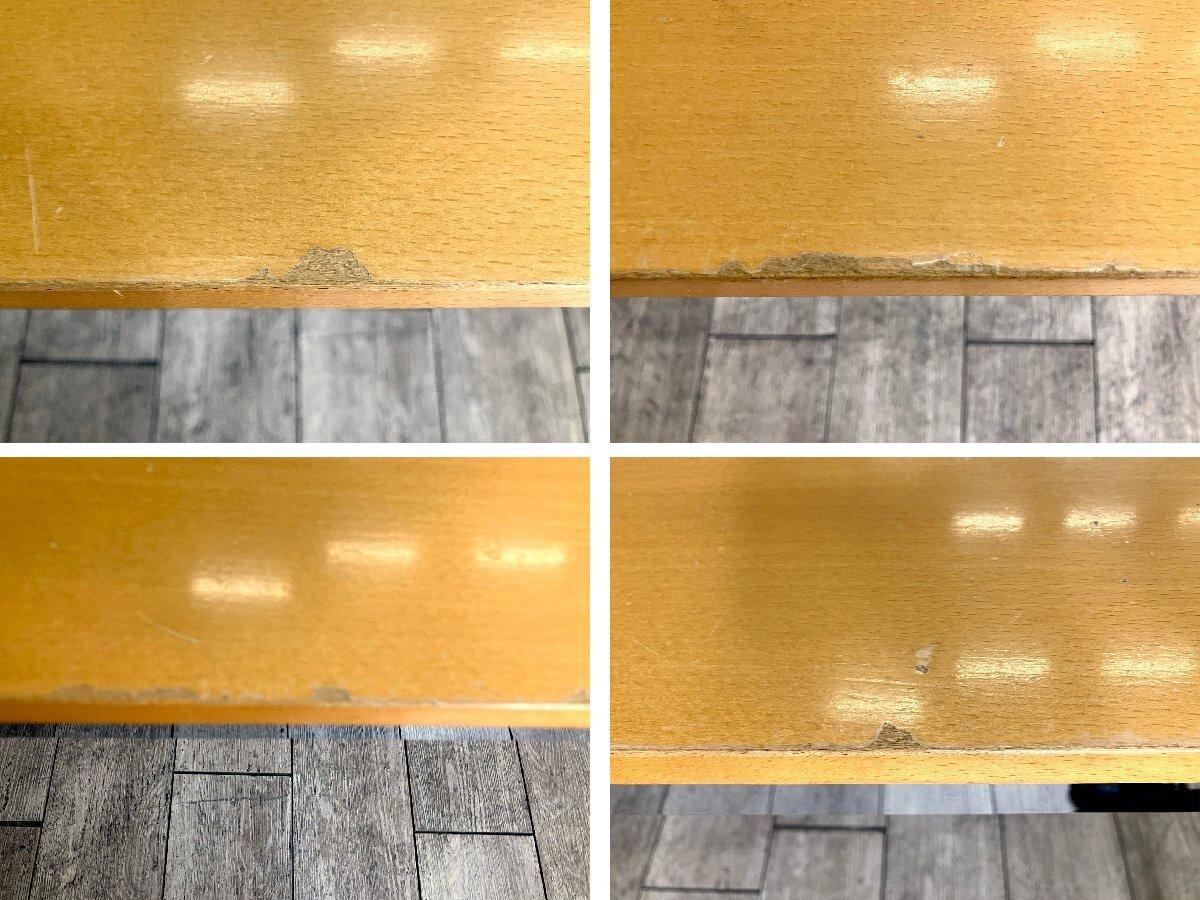 - 目立つ箇所あり傷・凹みが多数、深い傷・凹みが一部ある。(例、天板、幕板、棚板、サイド部分、脚部等にある。)
