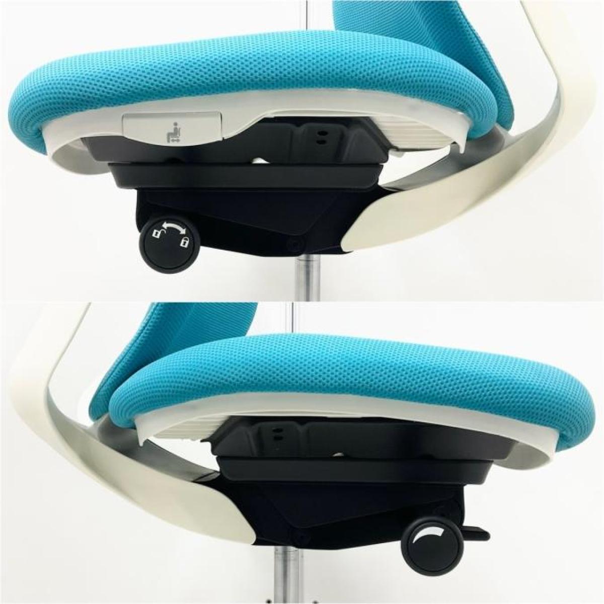 - 座面左下のダイヤルでリクライニングの固定と解除が行えます。 前傾ポジションをとることも可能です。