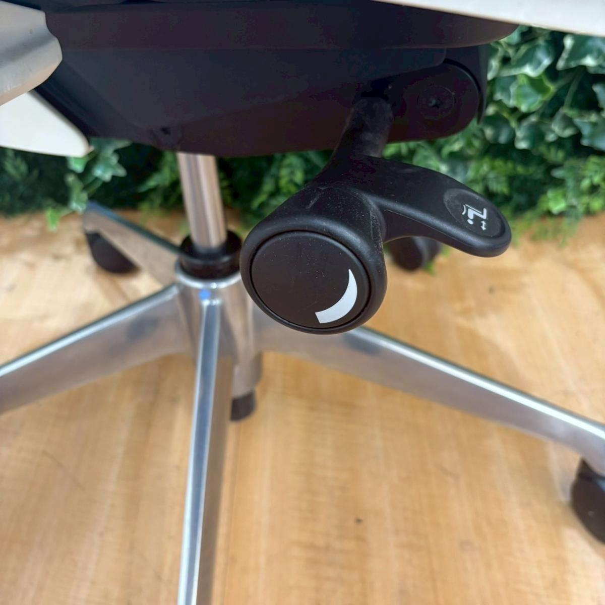 - 座面右下のダイヤル操作で、リクライニングの強弱調整が行えます。これまでのダイヤル式よりも、少ない回転数で、最弱?最強の調整が可能です。