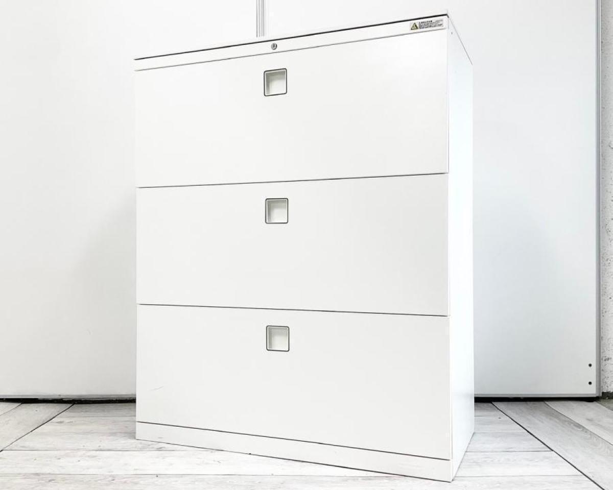■オカムラ(okamura)製 レクトラインシリーズ 3段ラテラル ローキャビネット ■天板・ベース付 ■シリンダー錠 ■ホワイト ■収納力抜群【弊社使用欄:A01037187】【SN】