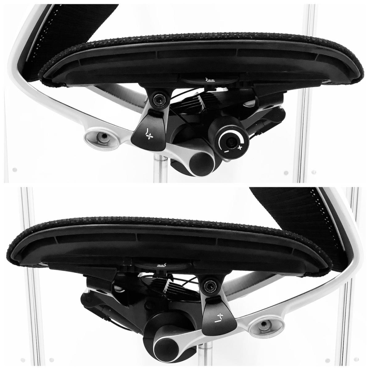 もちろん座り心地もコンテッサの直系ですから快適です。座面の素材はクッションとメッシュの2タイプあります。私、個人的には座面の中心部分でも外側でもテンションが変わらないクッション素材が、足を閉じても開いても快適なので推しです!"