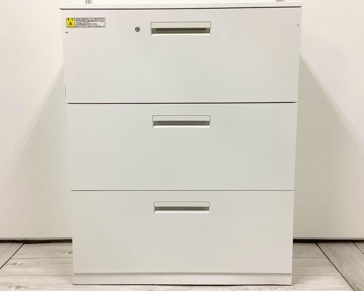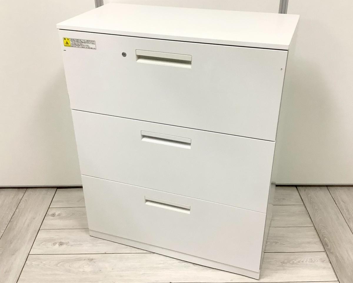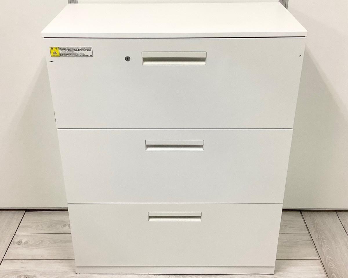 【ファイル収納に便利な引出し型キャビネット!】■ウチダ(UCHIDA) HSシリーズ 3段ラテラル書庫 ホワイト ※日焼け・キズありのためお安く!