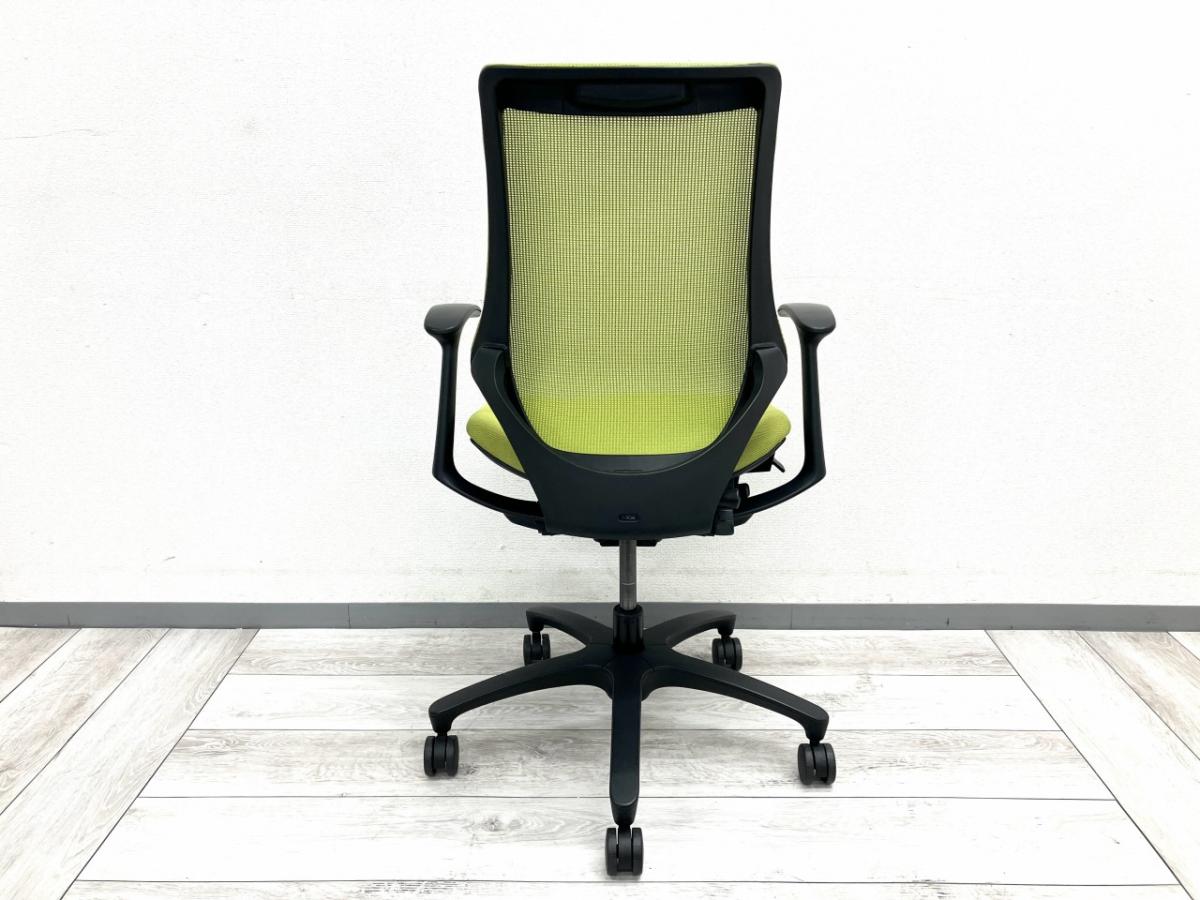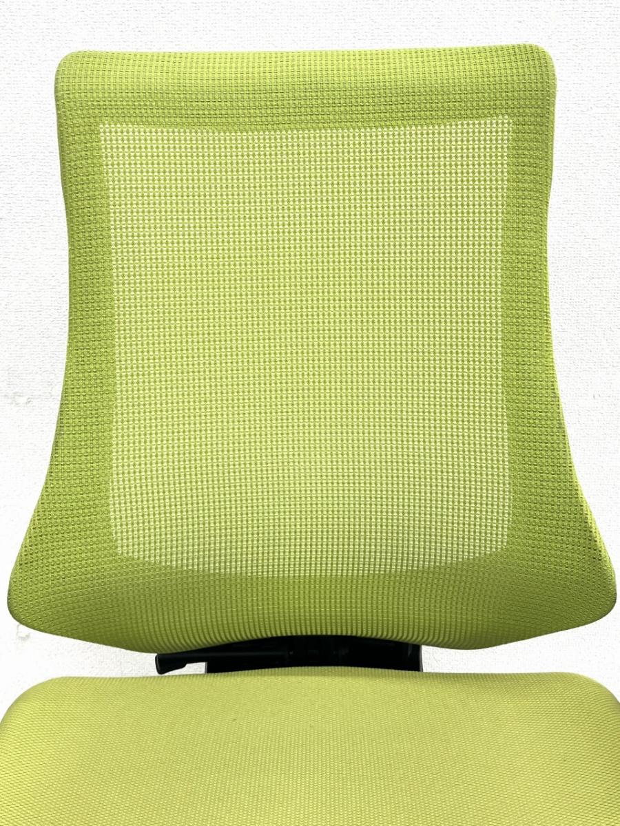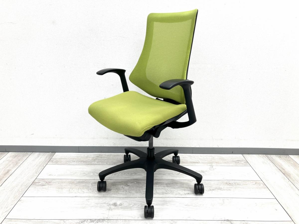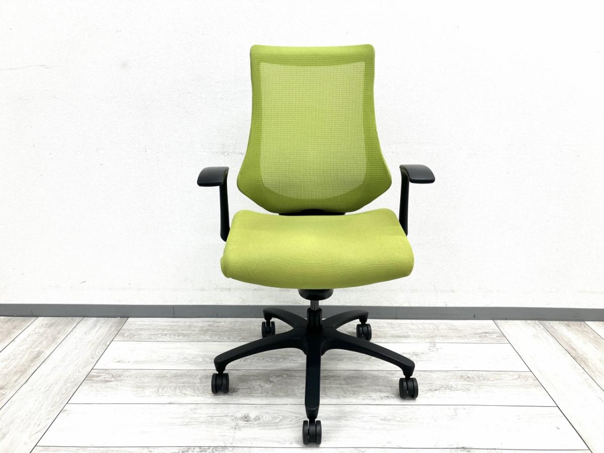 軽快な座り心地が魅力のエフチェアは、骨盤を自然に立てやすく、前傾・後傾どちらの姿勢にも対応できる設計になっています。肘掛けは固定式で安定感があり、タイピング時の腕の負担軽減にも効果的。ライトグリーンは中古市場でも人気が高く、明るいオフィス作りを目指す方に特におすすめです。コストパフォーマンス重視の方にも非常に扱いやすいモデルです。