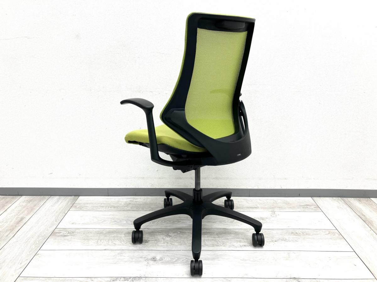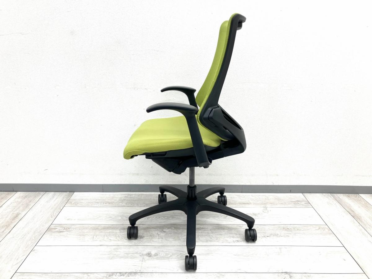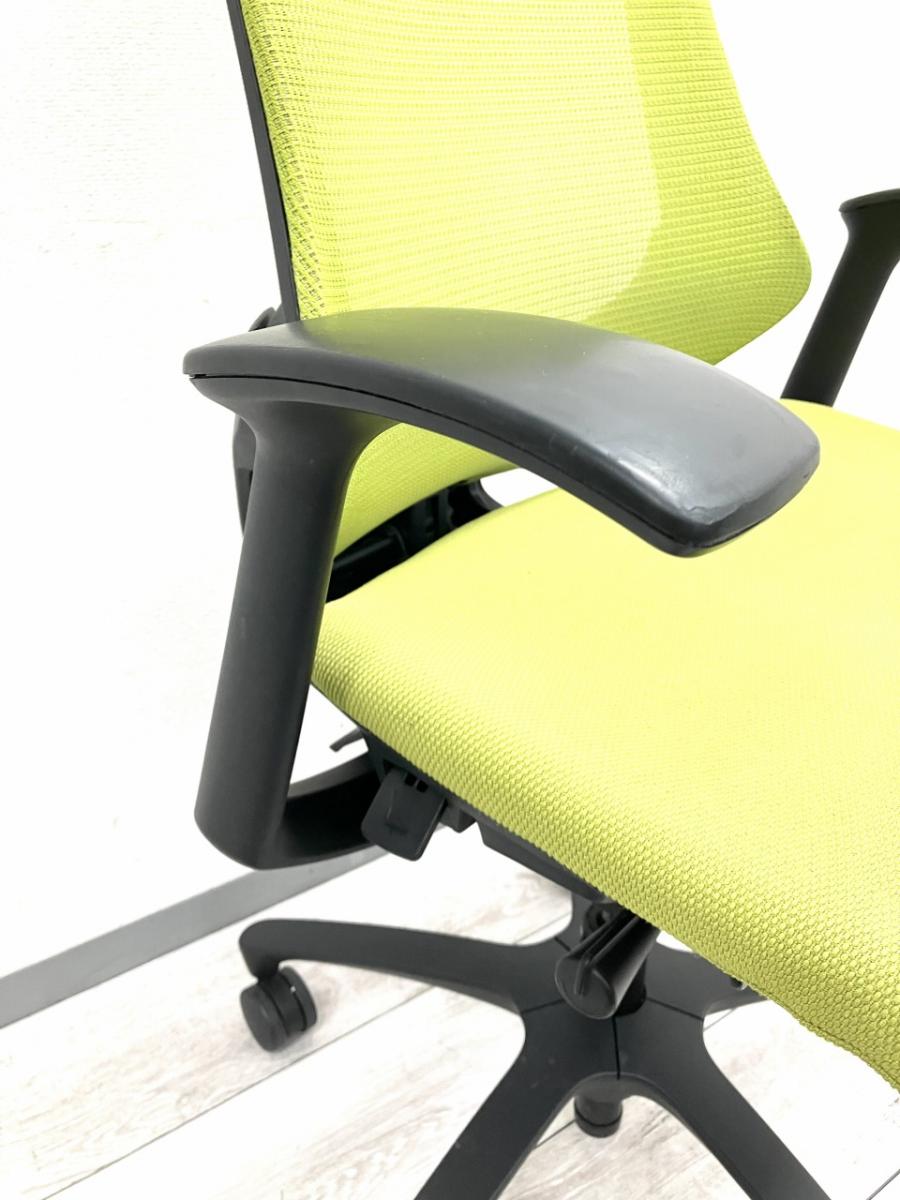 軽快な座り心地が魅力のエフチェアは、骨盤を自然に立てやすく、前傾・後傾どちらの姿勢にも対応できる設計になっています。肘掛けは固定式で安定感があり、タイピング時の腕の負担軽減にも効果的。ライトグリーンは中古市場でも人気が高く、明るいオフィス作りを目指す方に特におすすめです。コストパフォーマンス重視の方にも非常に扱いやすいモデルです。