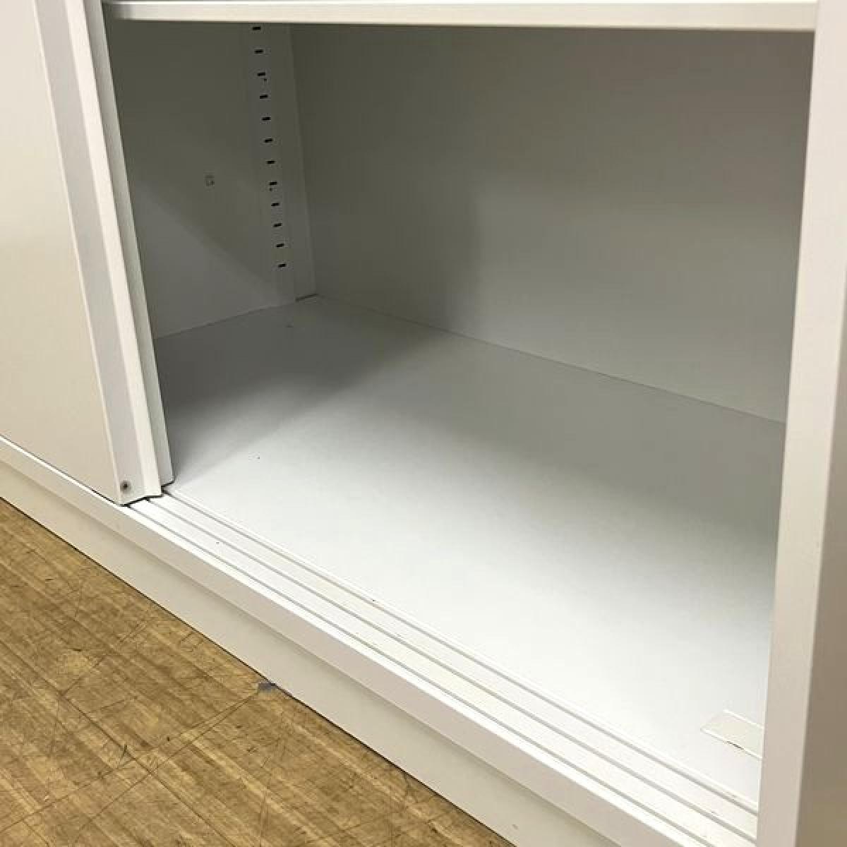 【スライド引き戸だから開閉スペースに困らない!】■コクヨ(KOKUYO)製 エディア(EDIA)シリーズ 2枚引き違い書庫 ローキャビネット シリンダー錠 天板付き ベース付き ホワイト シリンダー錠 収納 中古家具 格安 福岡 オフィス家具 九州最大級《オフィスバスターズ福岡博多店は、福岡を拠点として、日本全国へ中古オフィス用品・オフィス家具を提供しております》