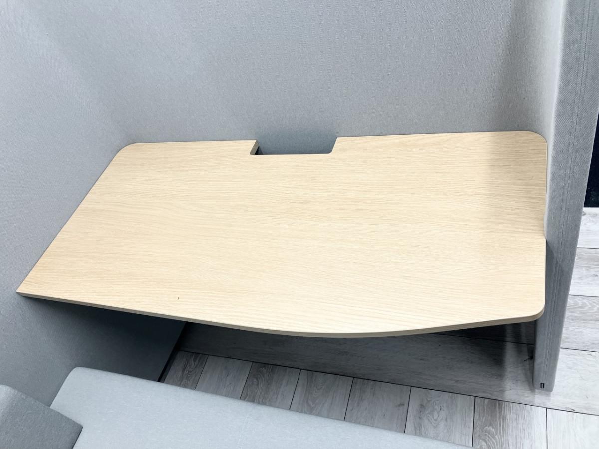 Bracketsシリーズの魅力は「短時間で深い集中に入れる環境」を提供できる点です。吸音性を考慮したパネルにより周囲の雑音を軽減し、オンライン会議や資料作成など静かな作業に最適。ソファはやや硬めで体をしっかり支えてくれるため、長時間でも疲れにくく、天板はノートPC・資料・飲み物を余裕を持って置ける実用的なサイズです。高価格帯モデルのため造りが非常に丁寧で、中古でも満足度の高い商品です。来客時の簡易打合せブース、集中席、個別学習席、コワーキングの個室代替など、多用途で活躍します。