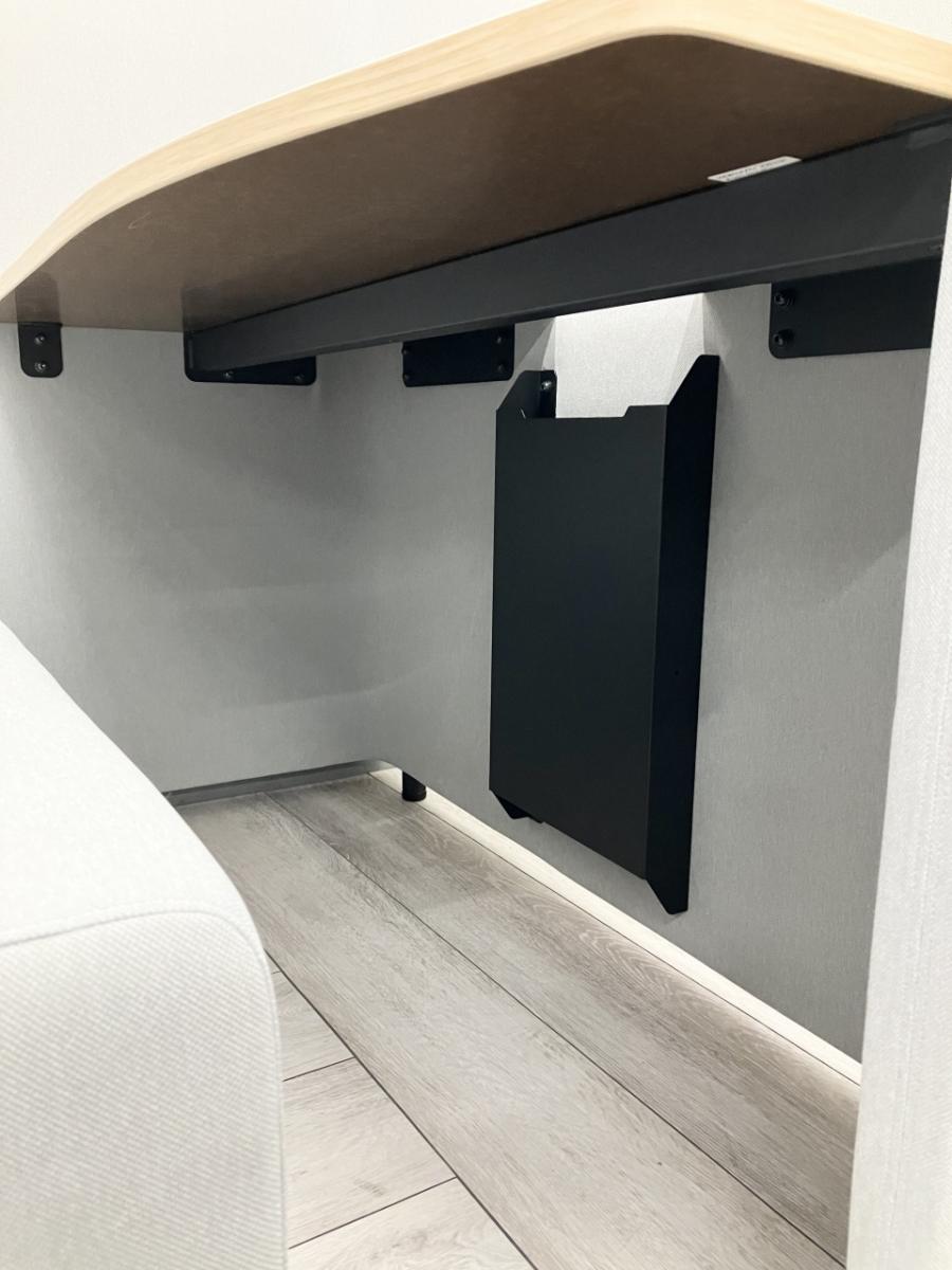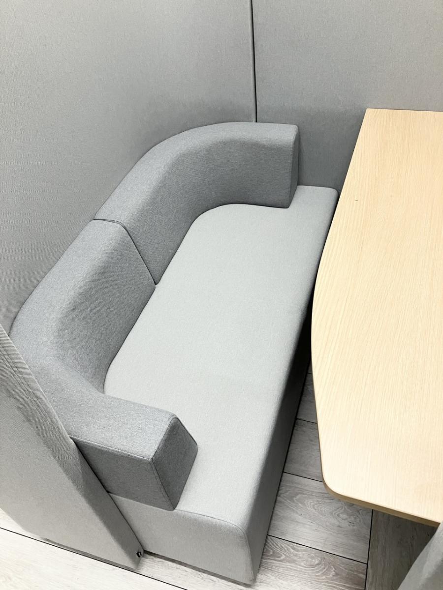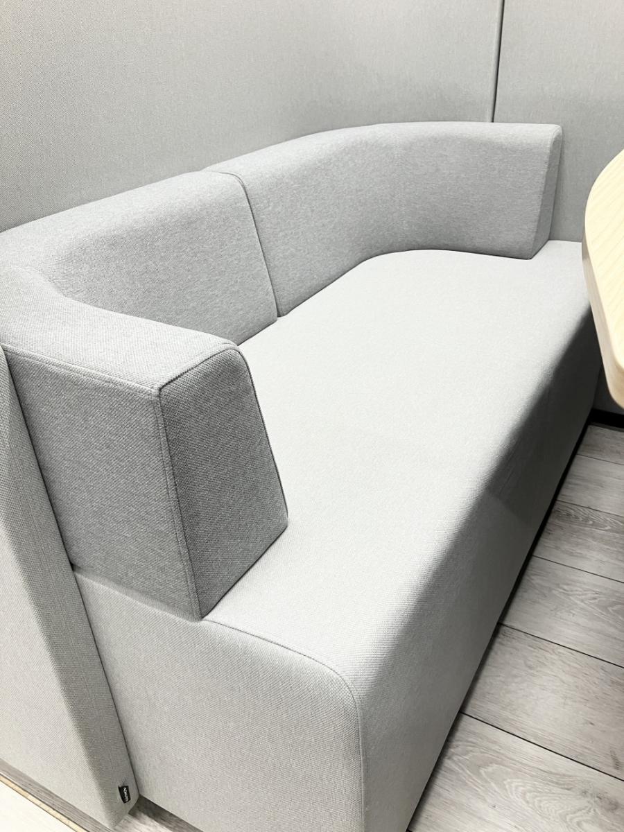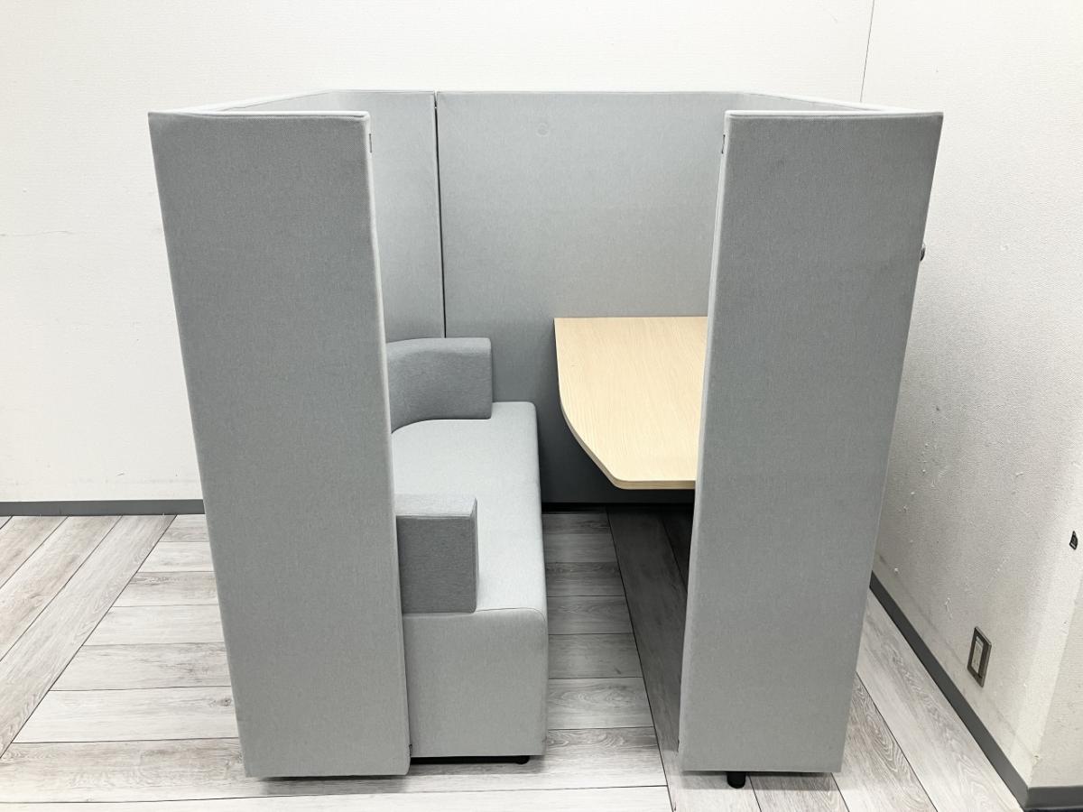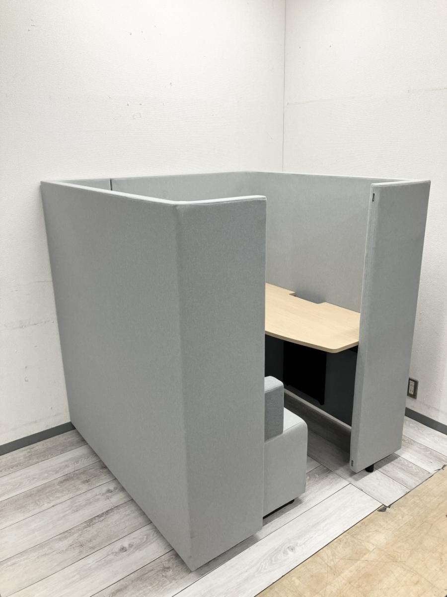 Bracketsシリーズの魅力は「短時間で深い集中に入れる環境」を提供できる点です。吸音性を考慮したパネルにより周囲の雑音を軽減し、オンライン会議や資料作成など静かな作業に最適。ソファはやや硬めで体をしっかり支えてくれるため、長時間でも疲れにくく、天板はノートPC・資料・飲み物を余裕を持って置ける実用的なサイズです。高価格帯モデルのため造りが非常に丁寧で、中古でも満足度の高い商品です。来客時の簡易打合せブース、集中席、個別学習席、コワーキングの個室代替など、多用途で活躍します。