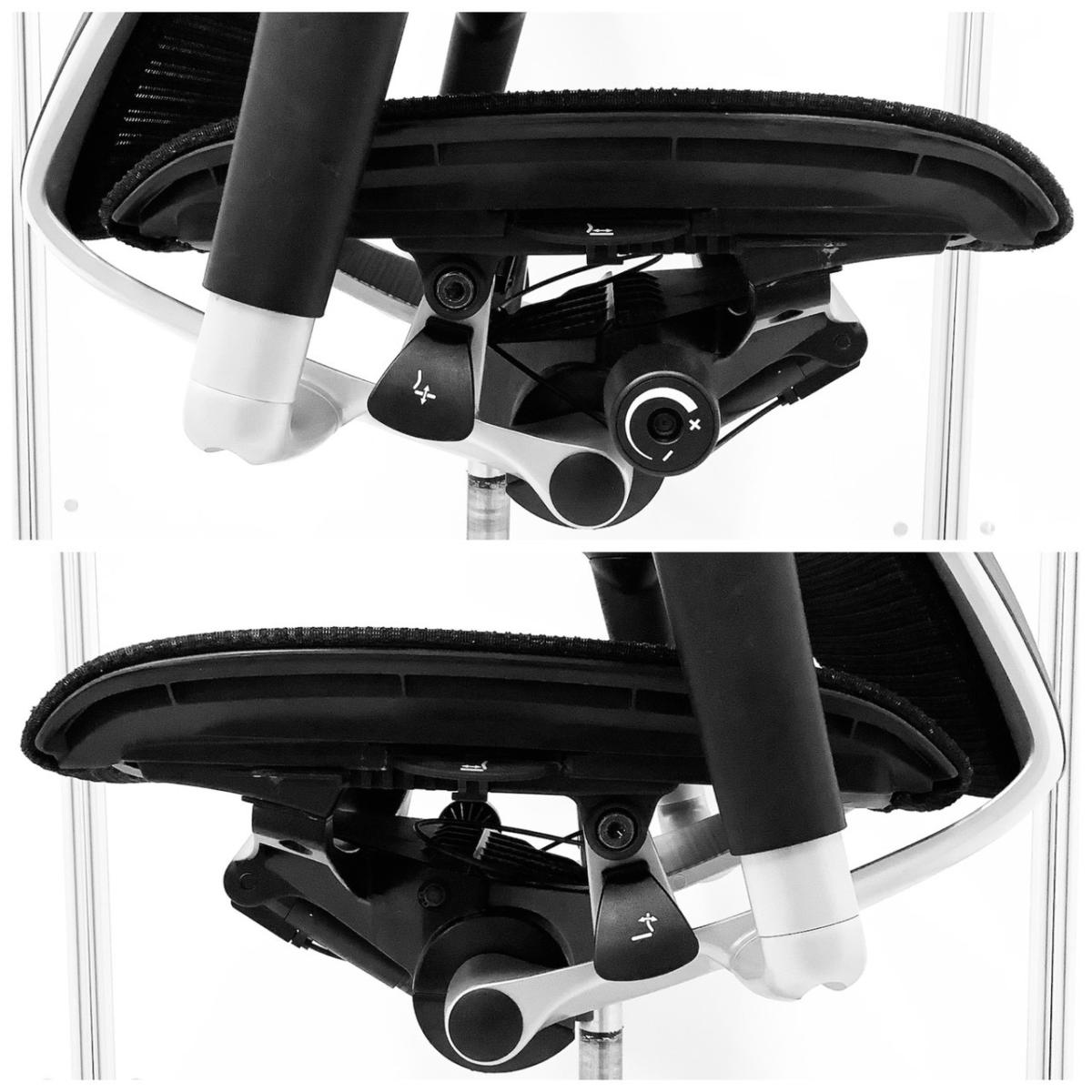 もちろん座り心地もコンテッサの直系ですから快適です。座面の素材はクッションとメッシュの2タイプあります。私、個人的には座面の中心部分でも外側でもテンションが変わらないクッション素材が、足を閉じても開いても快適なので推しです!"