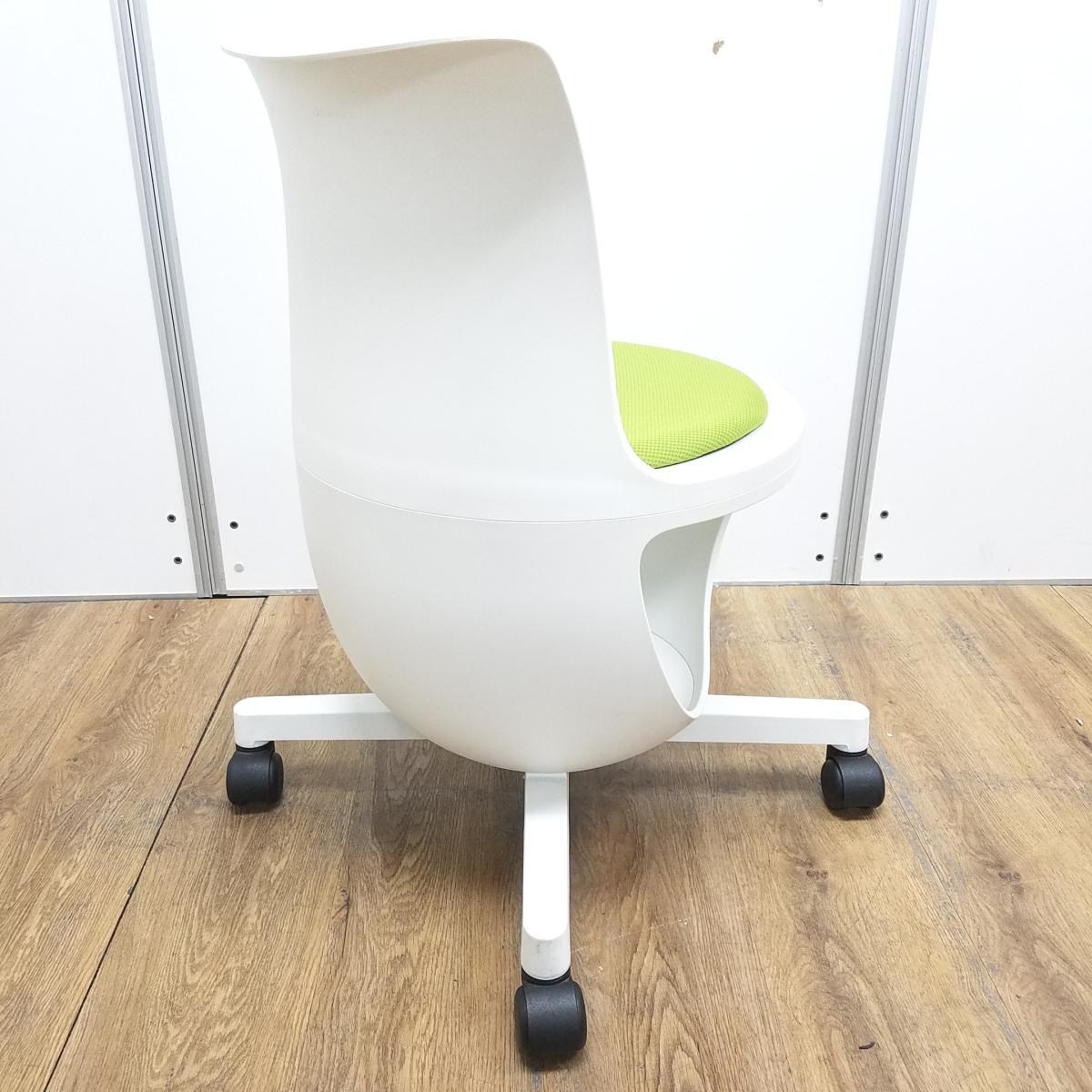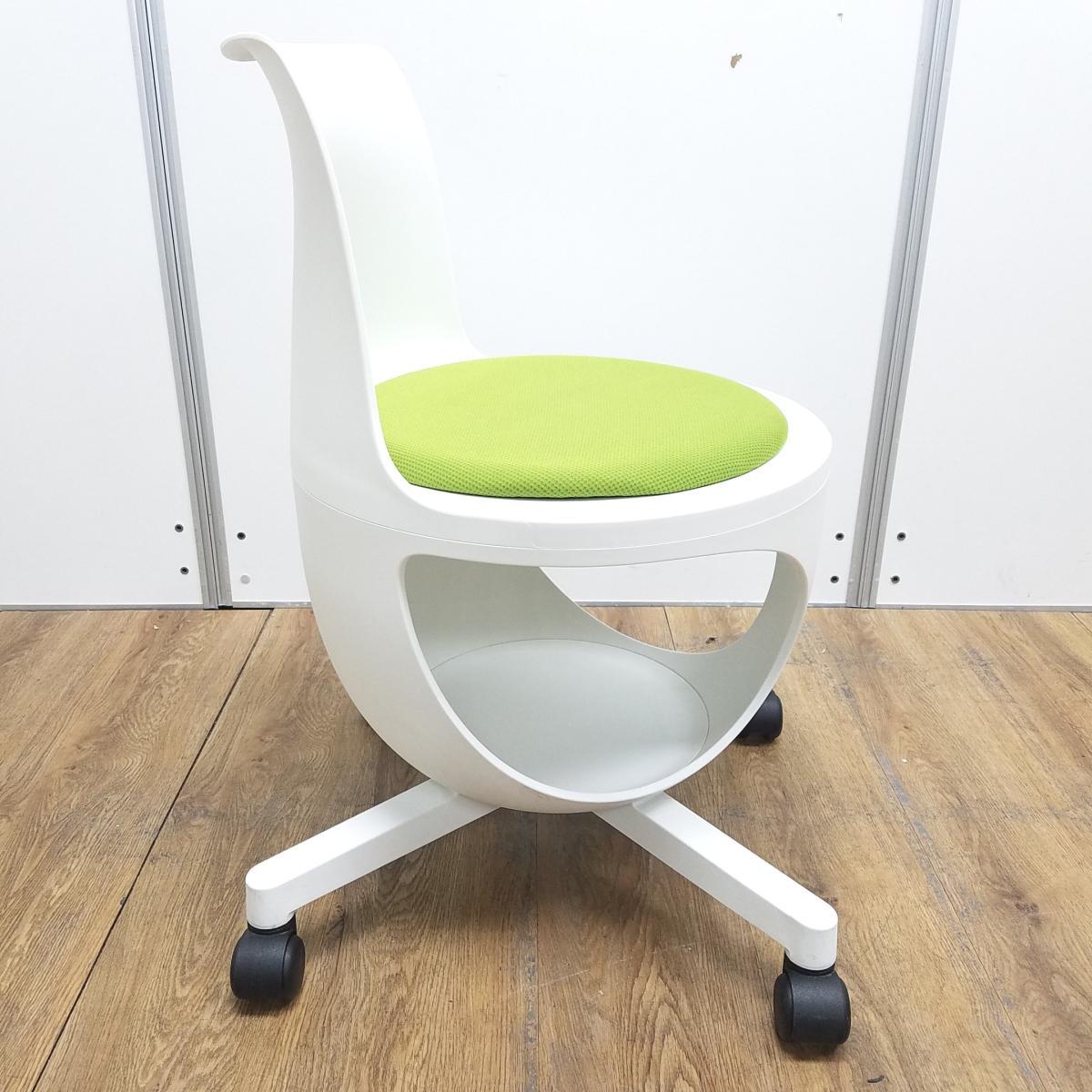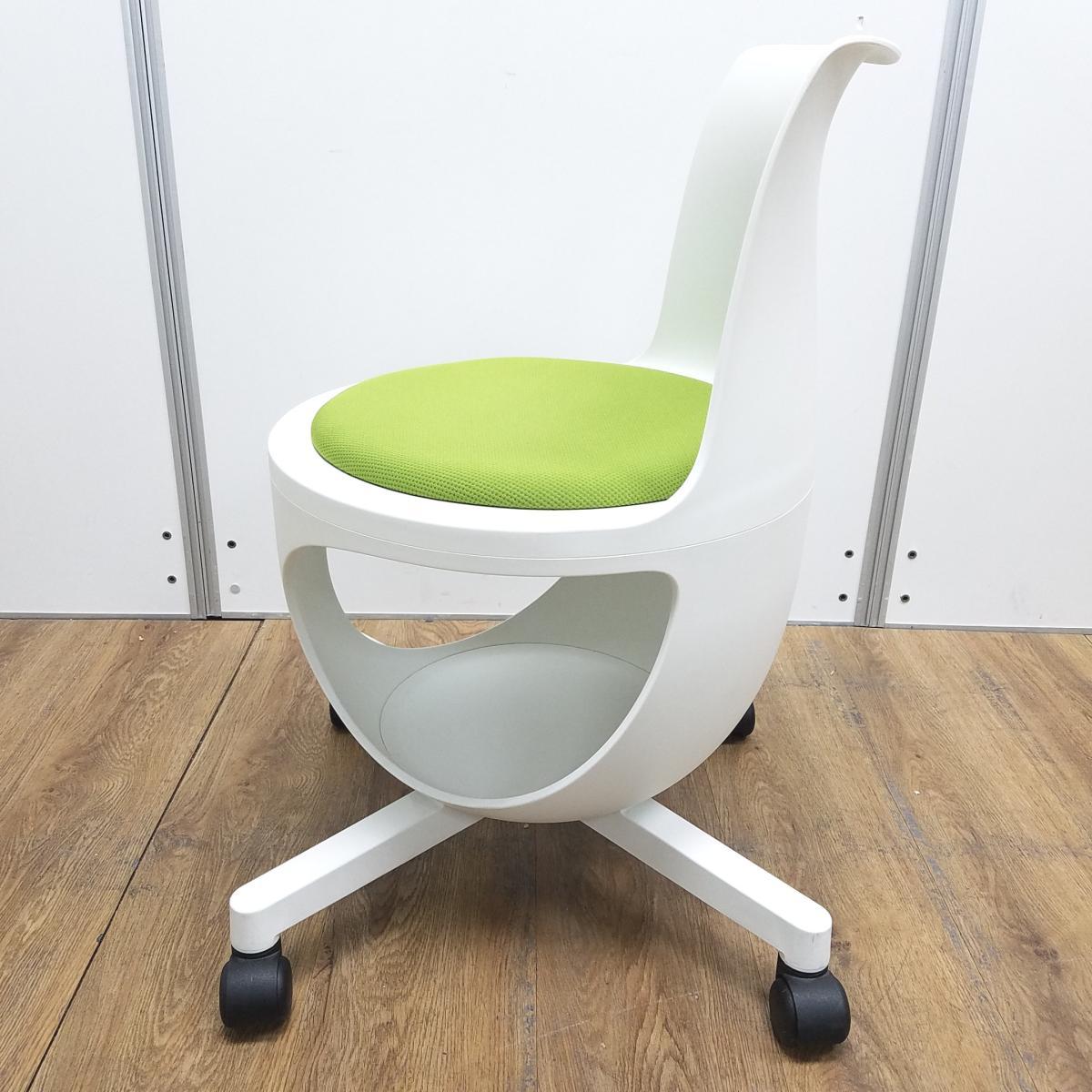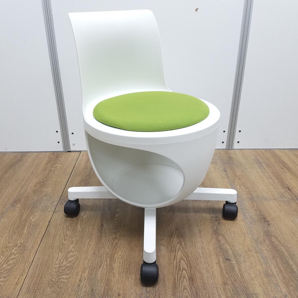 ★【T2】【商品入替のため、残り1脚限り】オカムラ製 イーチェア(e-chair) グリーン 肘無 ミーティングチェア キャスター付 荷物置きスペース有 空間に活気と楽しさをもたらす、たまごのようなアクティブチェア! ミーティングチェア!!- 京都東寺店
