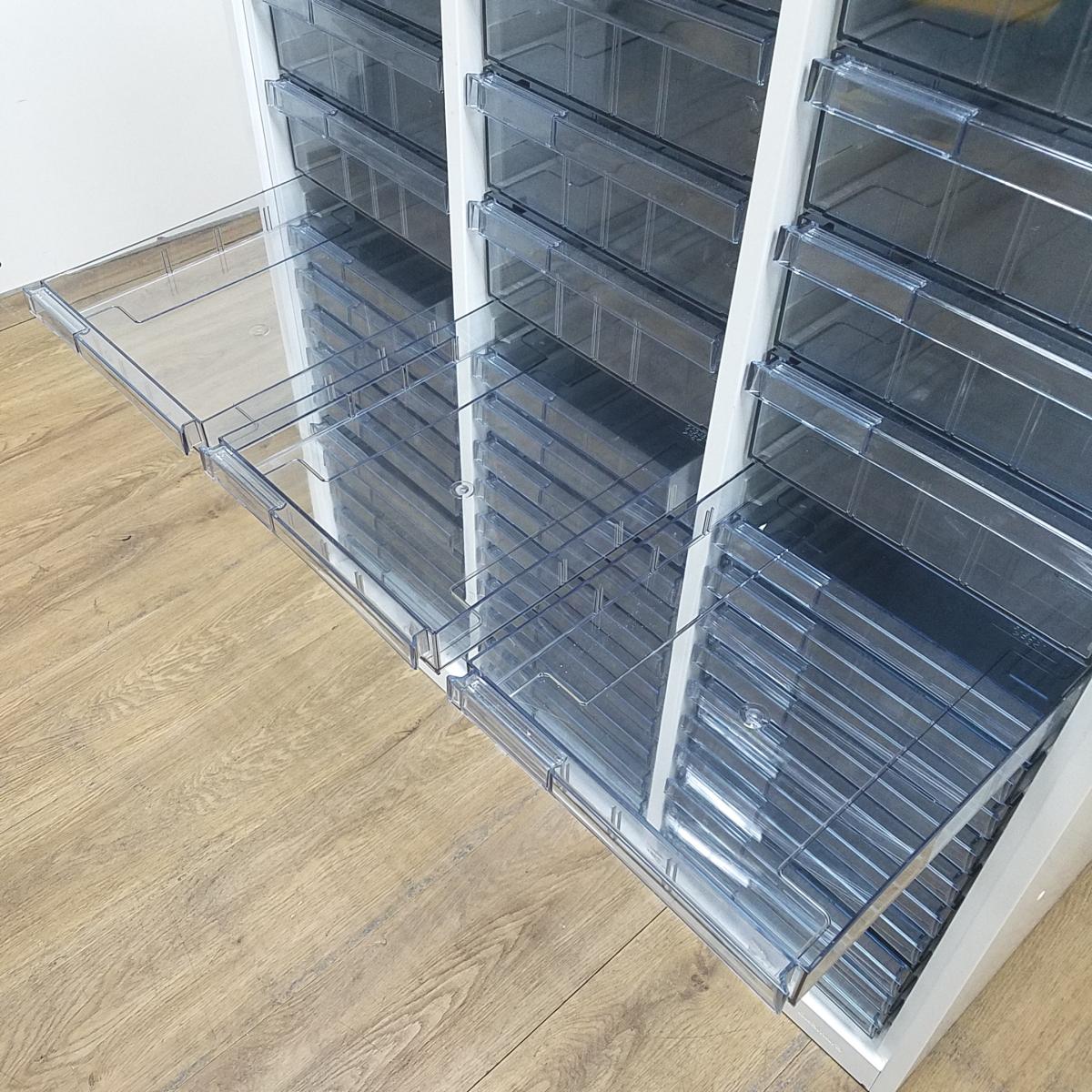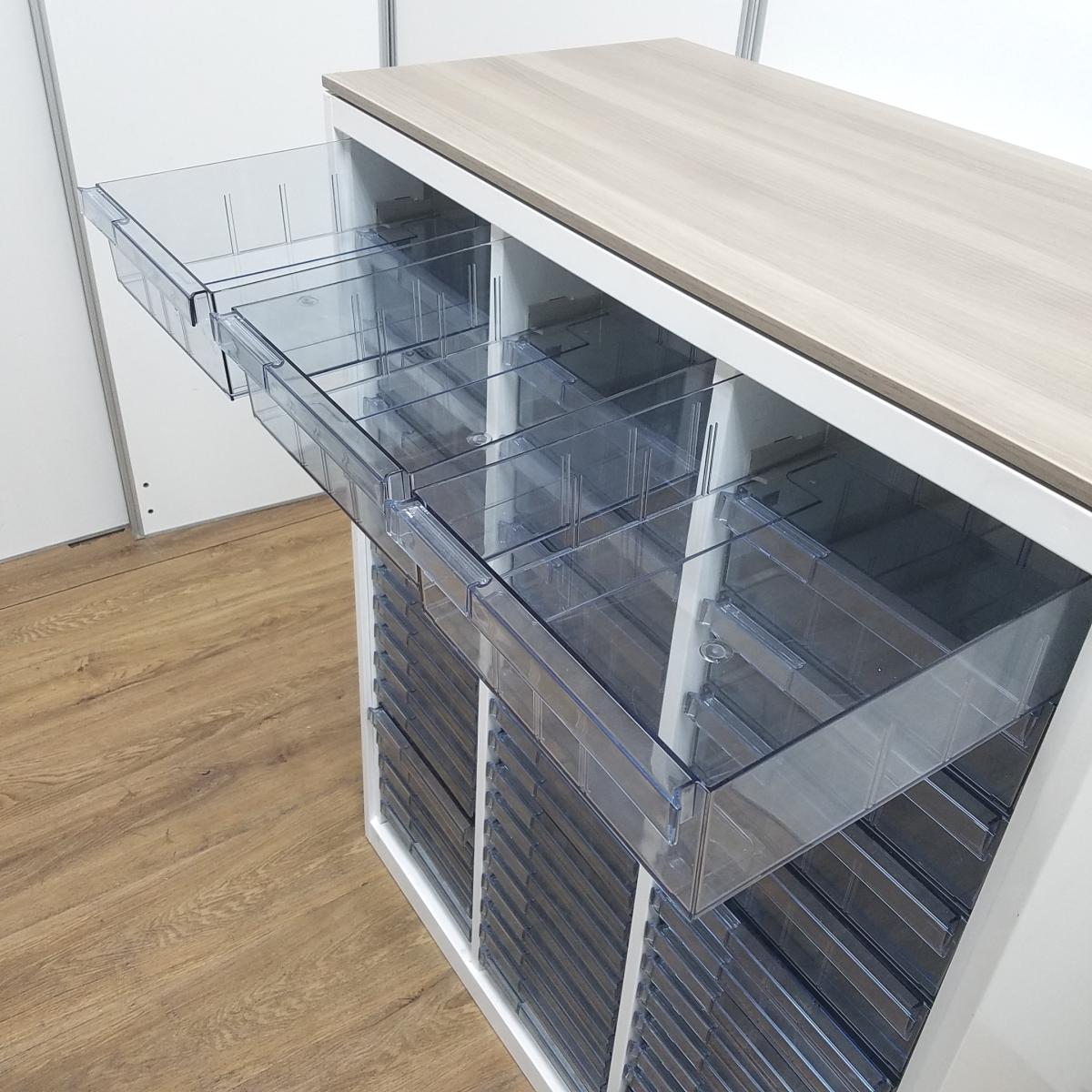 【書類・備品整理の必需品!書類や備品のストックにピッタリ!※1段目のみ浅型仕様】オカムラ レクトライン クリスタルトレー 書類 引き出し 透明 ケース ローキャビネット 整理 中古家具 オフィス家具 福岡 九州最大級《オフィスバスターズ福岡博多店は、福岡を拠点として、日本全国へ中古オフィス用品・オフィス家具を提供しております》