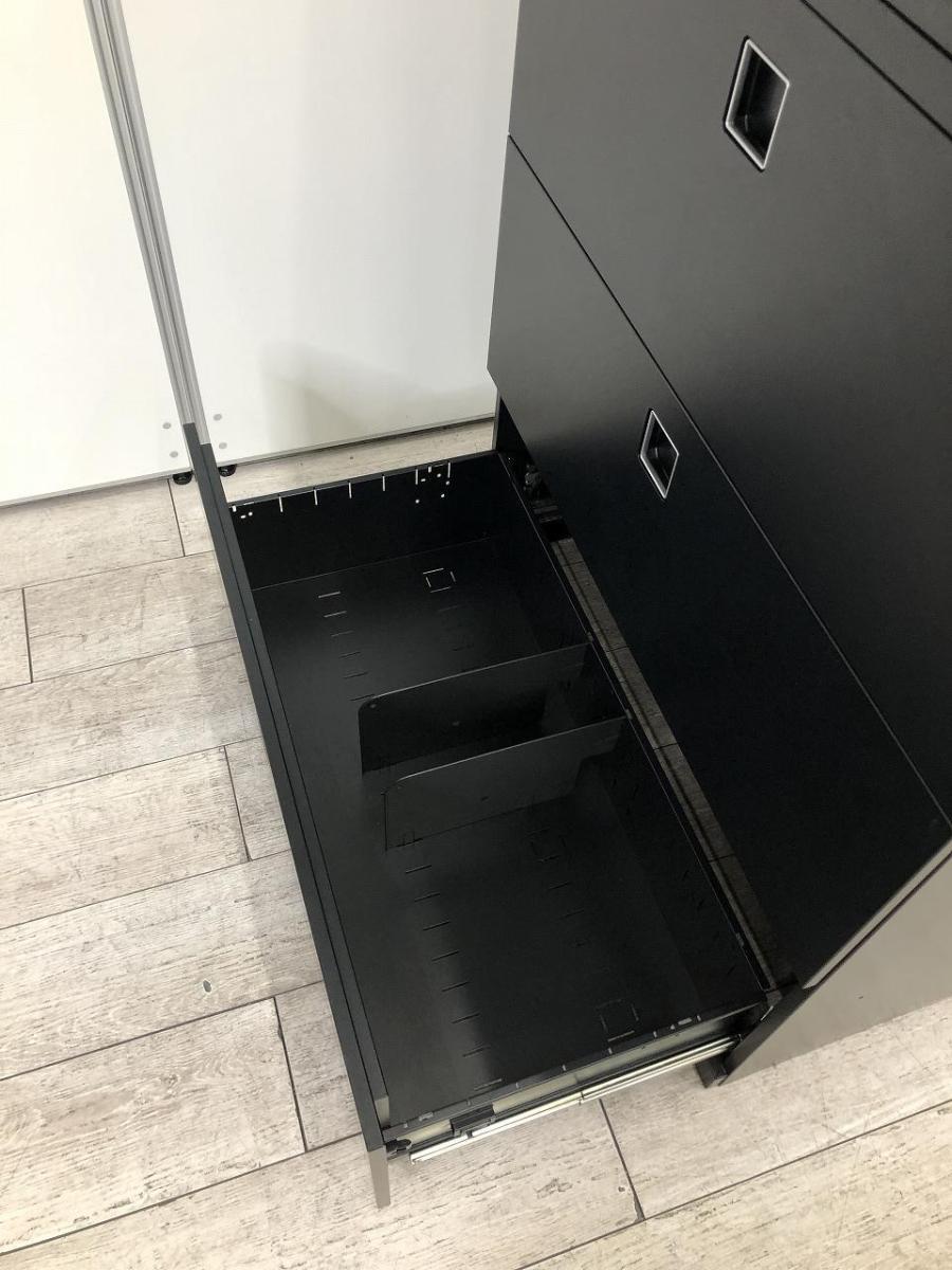 下段は3段ラテラル書庫を採用。引き出しは奥までしっかり引き出せるため視認性が高く、