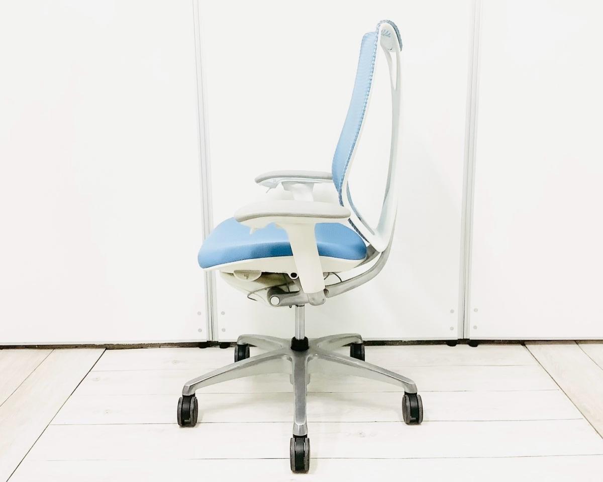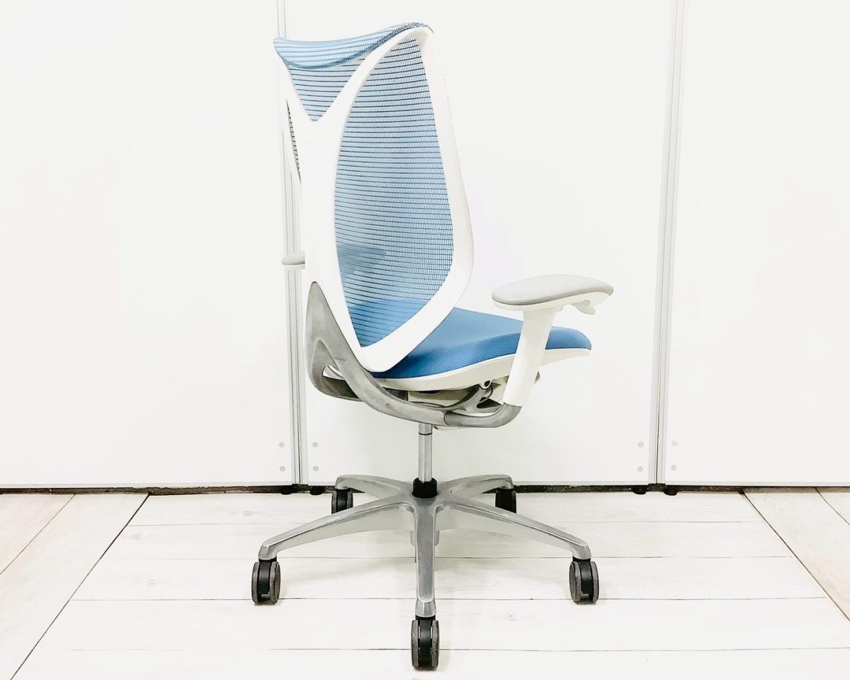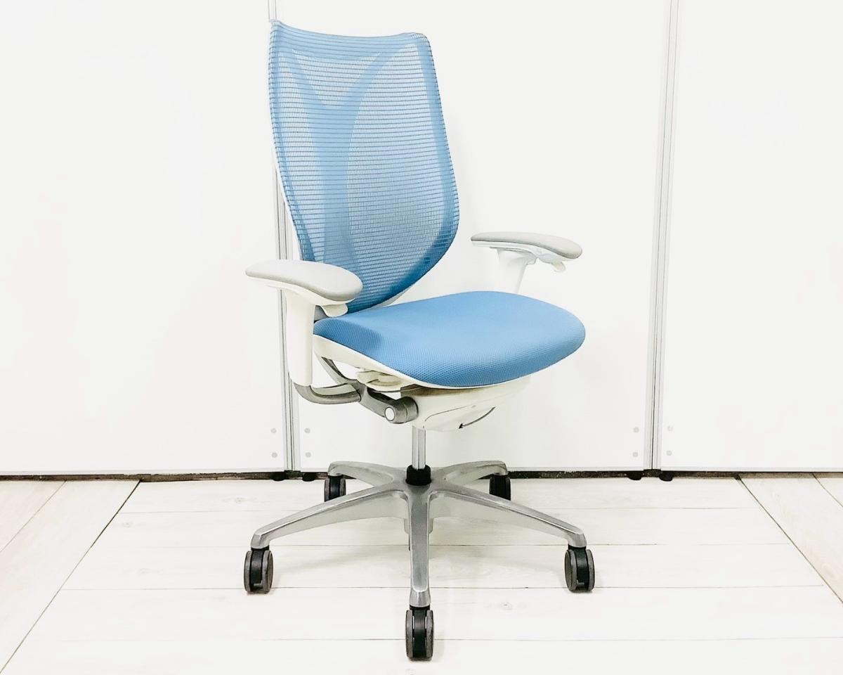 【前傾チルト付!流れるような美しいフォルムの最高級メッシュチェア!】■オカムラ(okamura)製 Sabrina(サブリナ) ハイバック 肘付き ■可動肘 ■背面メッシュ:アクアブルー 座面:ブルー ホワイトフレーム 【座面にダメージがあるためお値下げ商品】