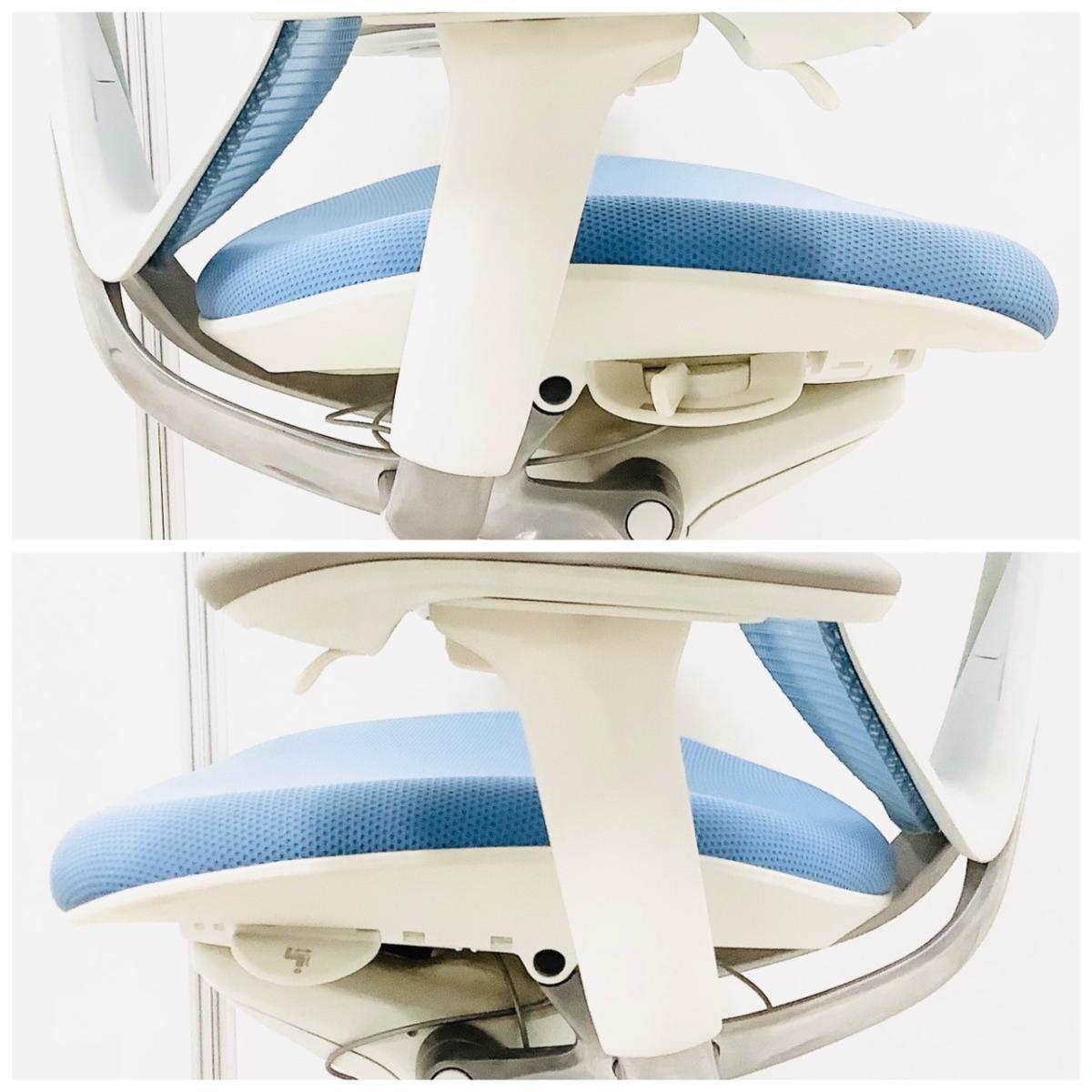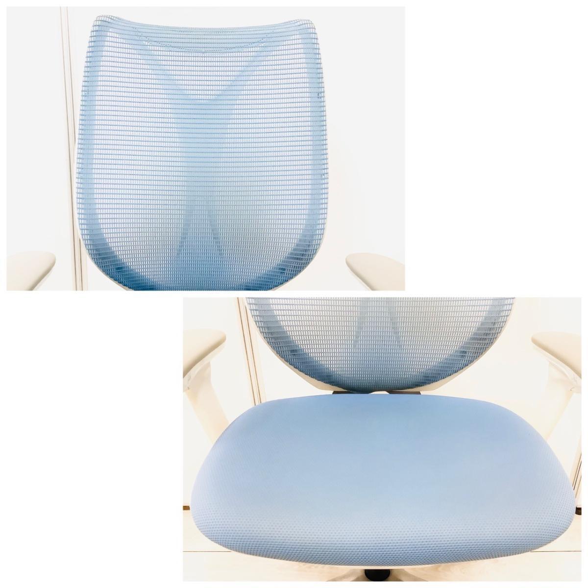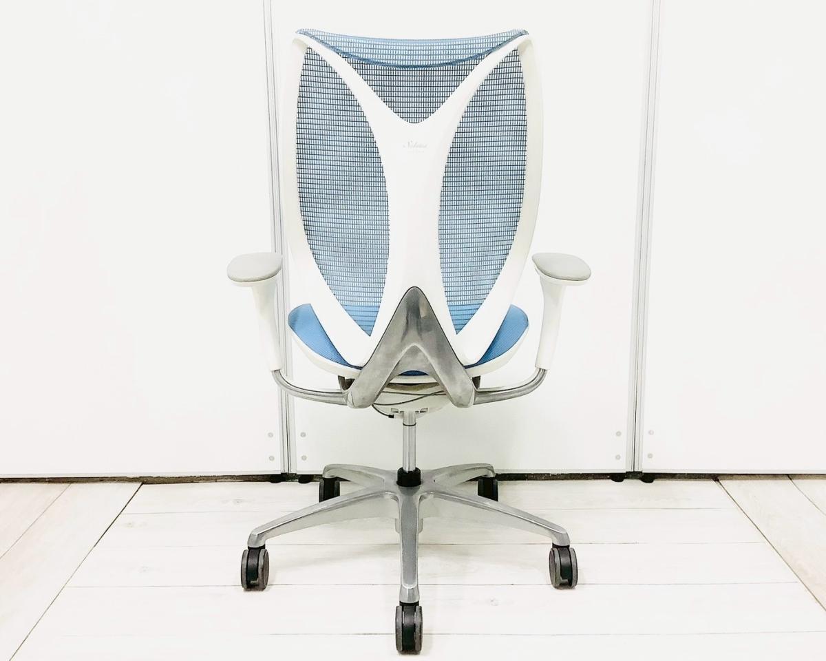 【前傾チルト付!流れるような美しいフォルムの最高級メッシュチェア!】■オカムラ(okamura)製 Sabrina(サブリナ) ハイバック 肘付き ■可動肘 ■背面メッシュ:アクアブルー 座面:ブルー ホワイトフレーム 【座面にダメージがあるためお値下げ商品】
