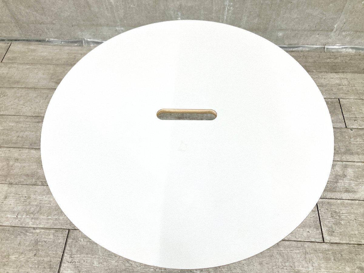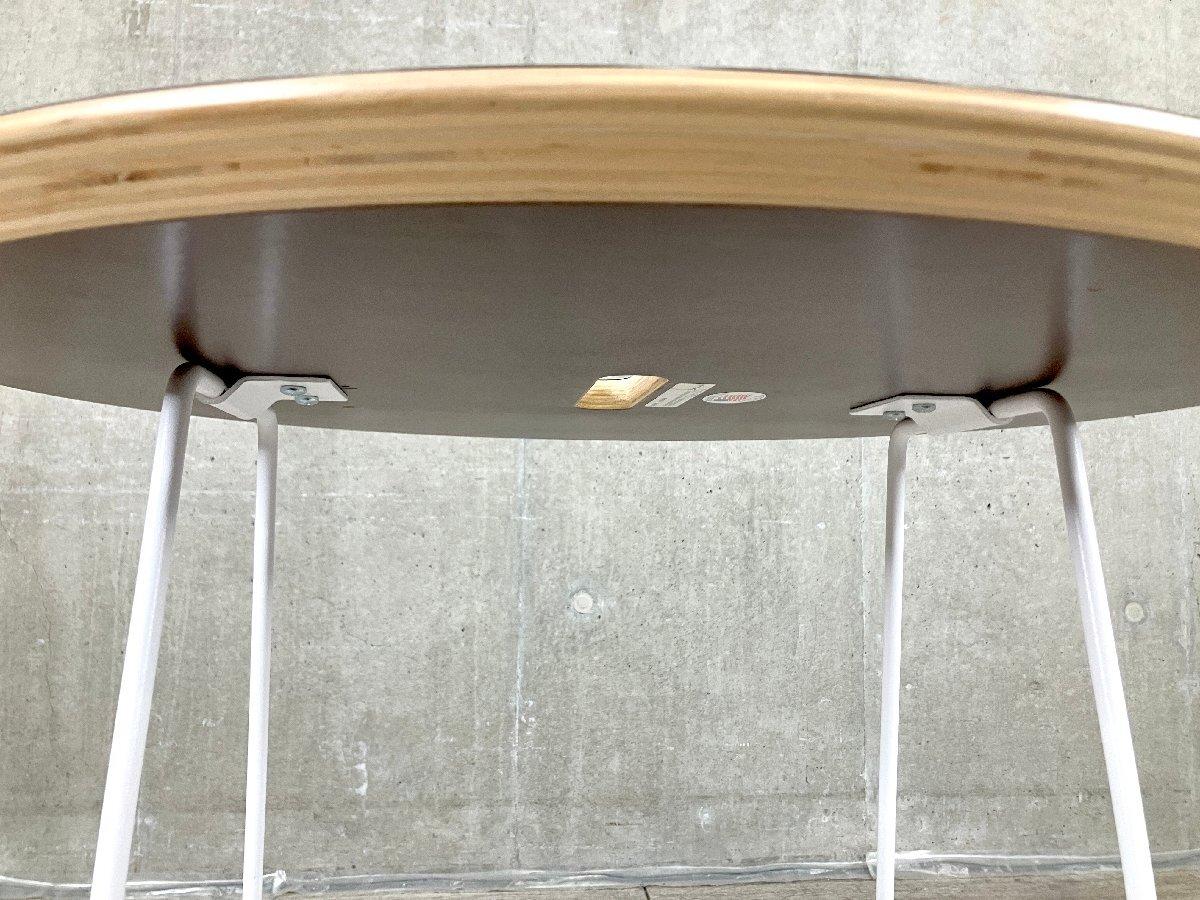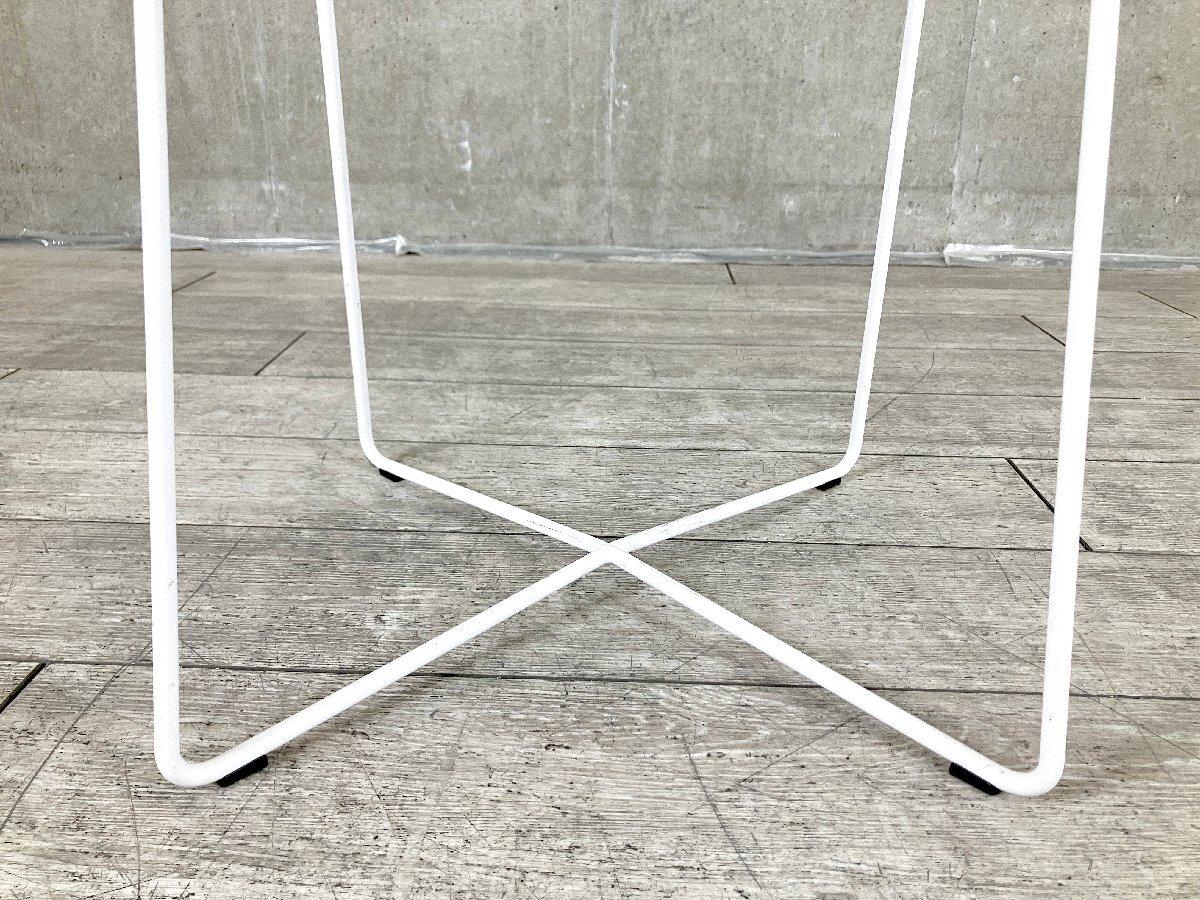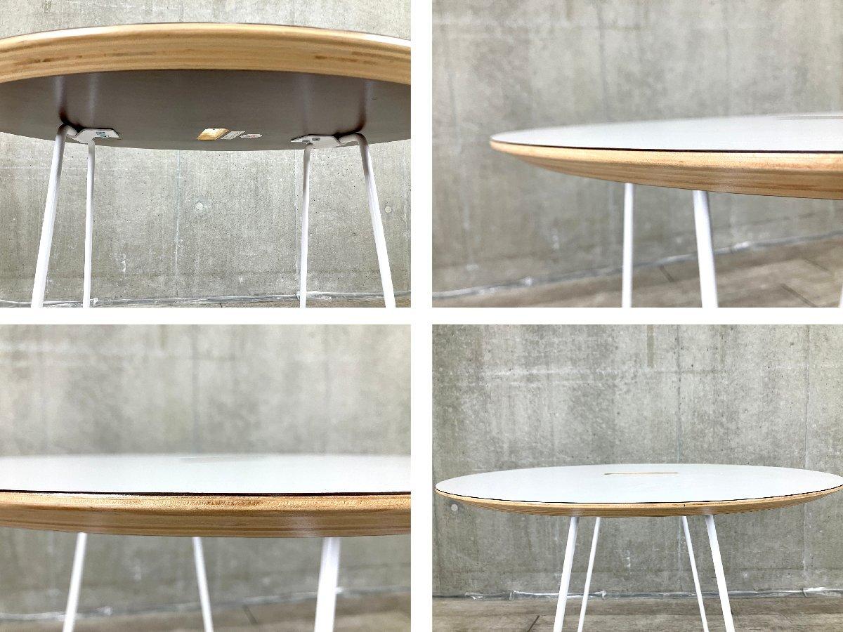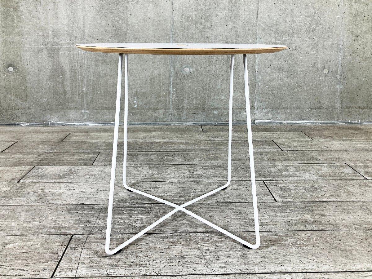 ワークプレイスやラウンジ空間を自由にレイアウトできるようデザインされたシリーズで、こちらのモデルは、薄い円形天板と繊細なワイヤーフレーム脚が特徴。視覚的な軽やかさが際立ち、空間に圧迫感を与えないミニマルな佇まいを持っています。