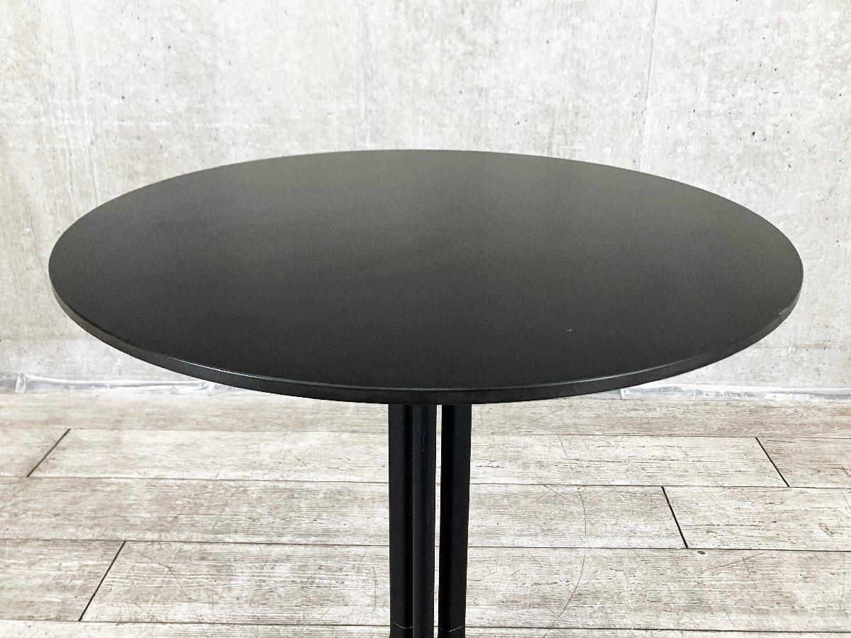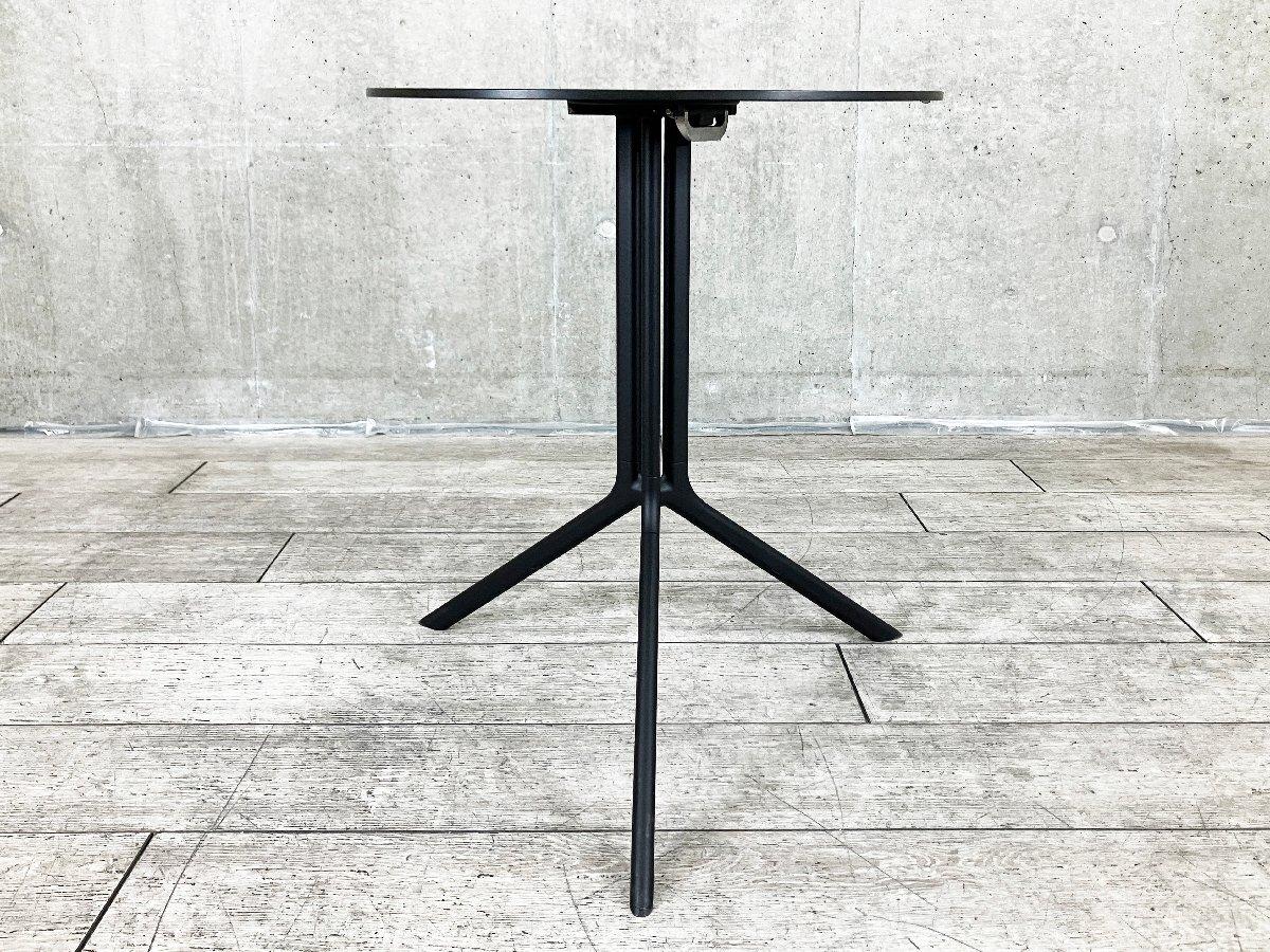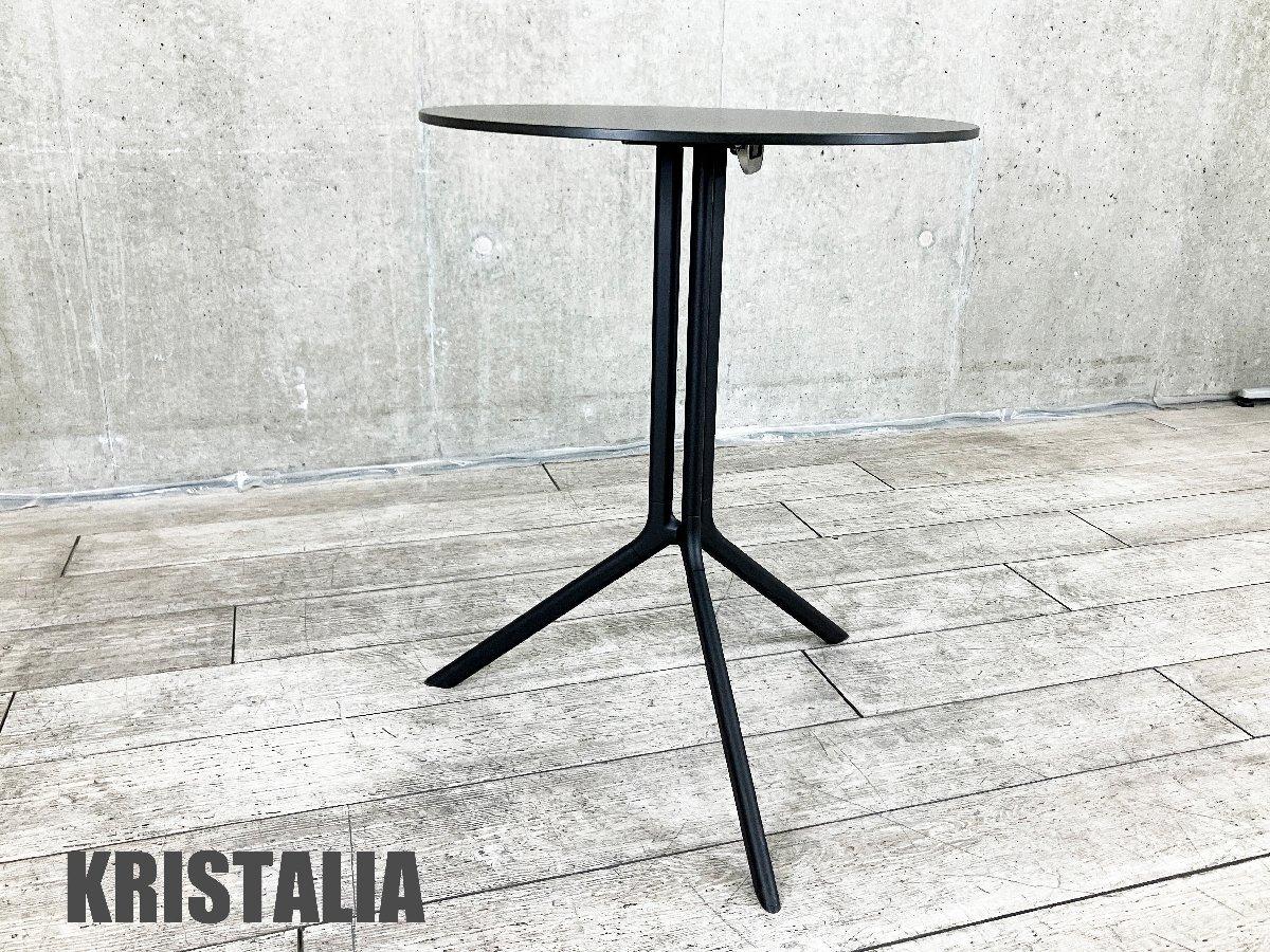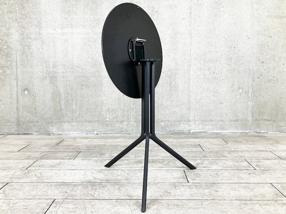 ■イタリアのブランド KRISTALIA(クリスタリア) による「Pole(ポール)」カフェテーブルです。 細く伸びる支柱と3本脚の軽やかなフレームが特徴で、ミニマルながらも存在感のあるデザインが魅力。薄い円形天板とのバランスが美しく、空間にすっきりとした印象を与えます。 また、天板を跳ね上げて収納できるフリップトップ機能を備えており、使用しない際は省スペースで片付けられるのもポイント。キャスターは付いていませんが、軽快な構造のため取り回しも容易です。オフィスのリフレッシュスペースやカフェ、ラウンジ、住宅のサイドテーブルとしても使いやすい一台です。