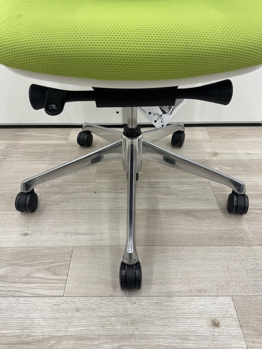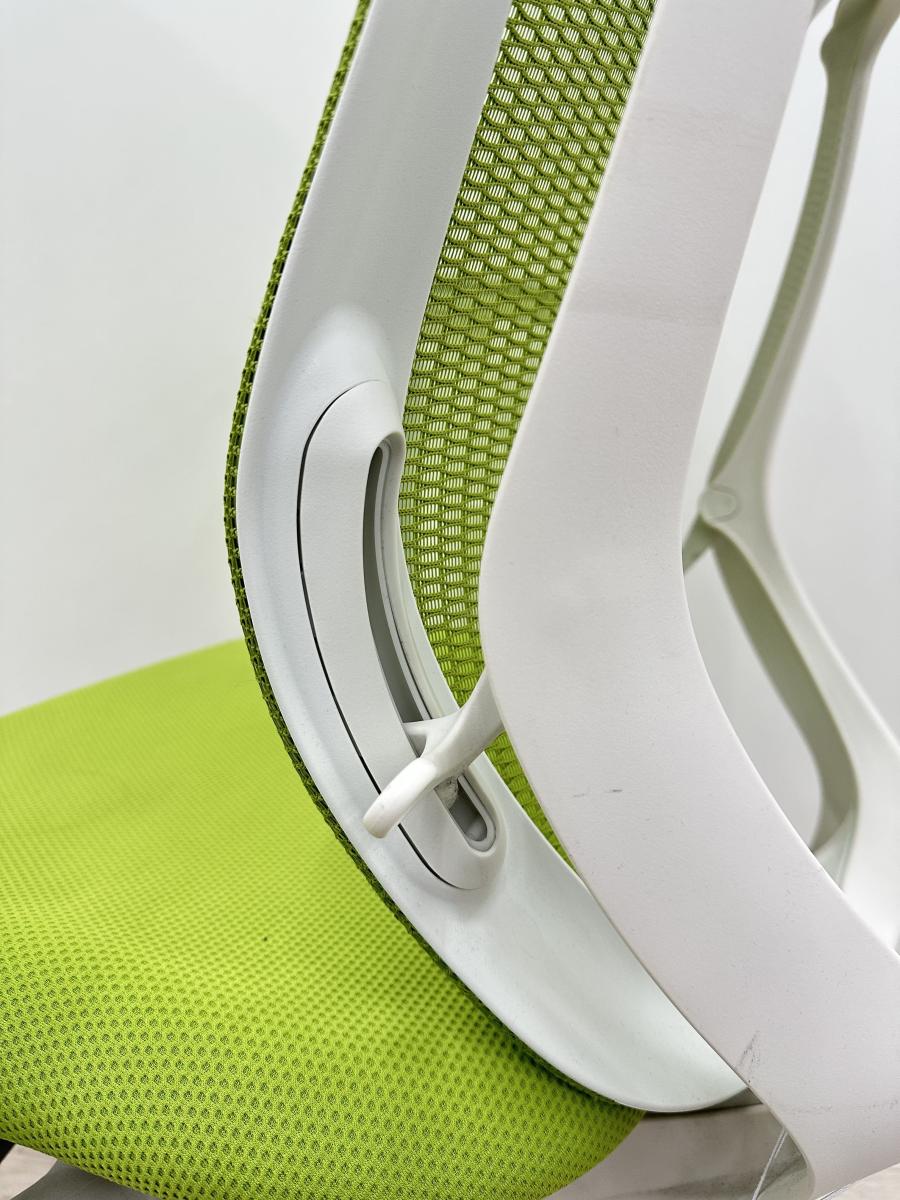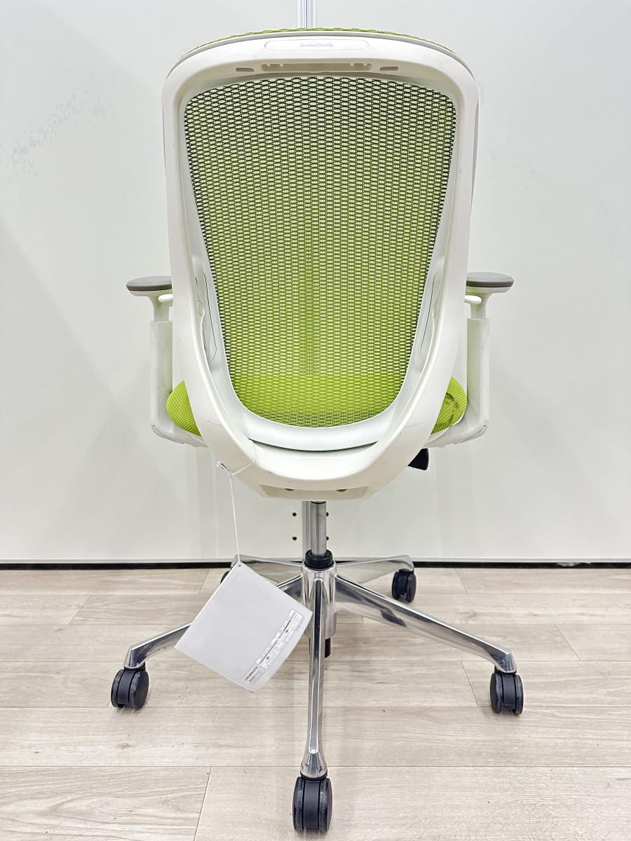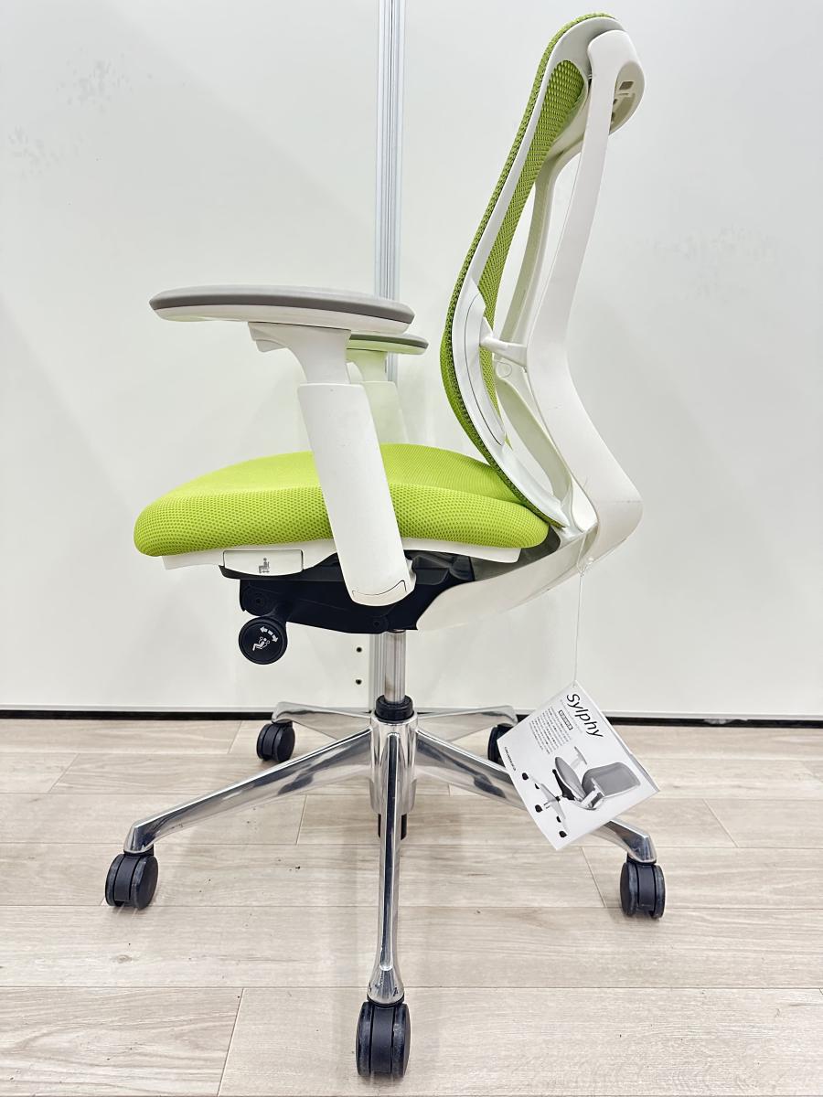 【商品入替】オカムラ製 シルフィシリーズ ライムグリーン ホワイトフレーム デザインアーム※固定肘 コートハンガー付き ローバック 肘無し 背面メッシュ 前傾チルト 自宅用 三次元曲面が快適にフィット! 機能付の大人気メッシュチェア! 肘付きローバックチェア!!豊中 尼崎 宝塚 西宮 伊丹 吹田