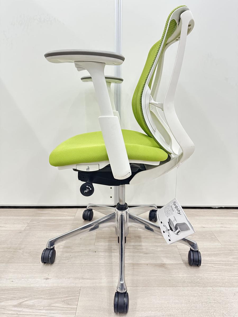 【商品入替】オカムラ製 シルフィシリーズ ライムグリーン ホワイトフレーム デザインアーム※固定肘 コートハンガー付き ローバック 肘無し 背面メッシュ 前傾チルト 自宅用 三次元曲面が快適にフィット! 機能付の大人気メッシュチェア! 肘付きローバックチェア!!