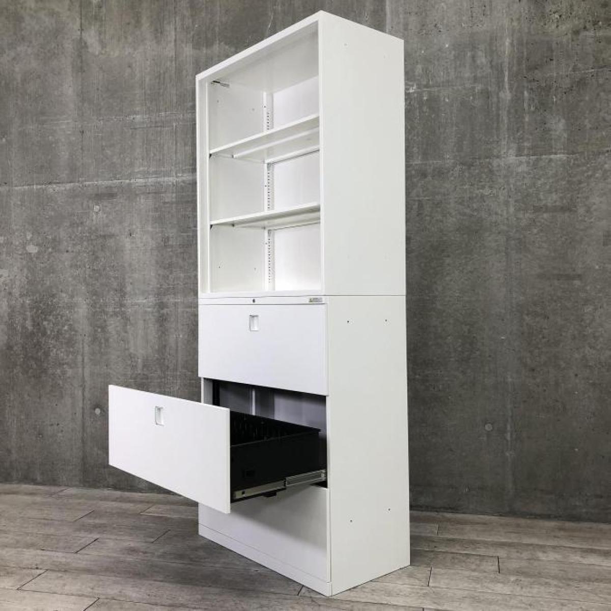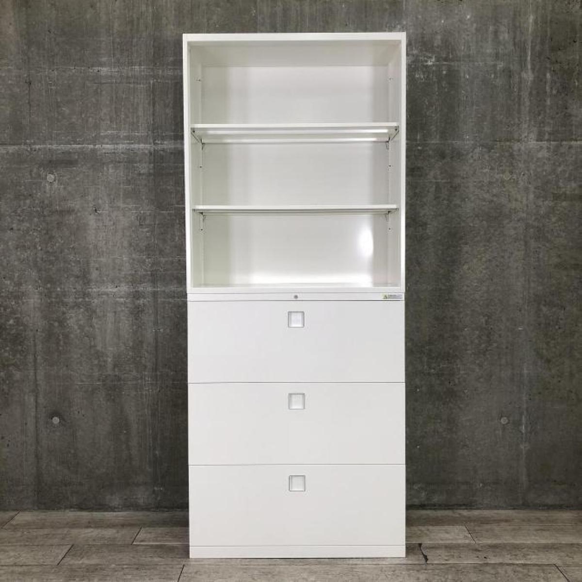 【大量収納の上下書庫!パッと見でわかるオープンタイプと鍵付き引き出しのラテラルセット】オカムラ レクトライン 上下書庫(上:オープン 下:3段ラテラル) 《オフィスバスターズ福岡博多店は、福岡を拠点として、日本全国へ中古オフィス用品・オフィス家具を提供しております》在庫がある店舗一覧