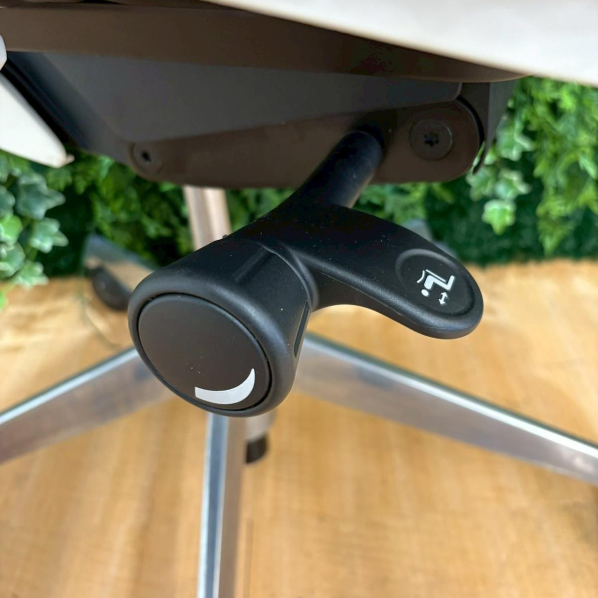- 座面右下のダイヤル操作で、リクライニングの強弱調整が行えます。これまでのダイヤル式よりも、少ない回転数で、最弱?最強の調整が可能です。