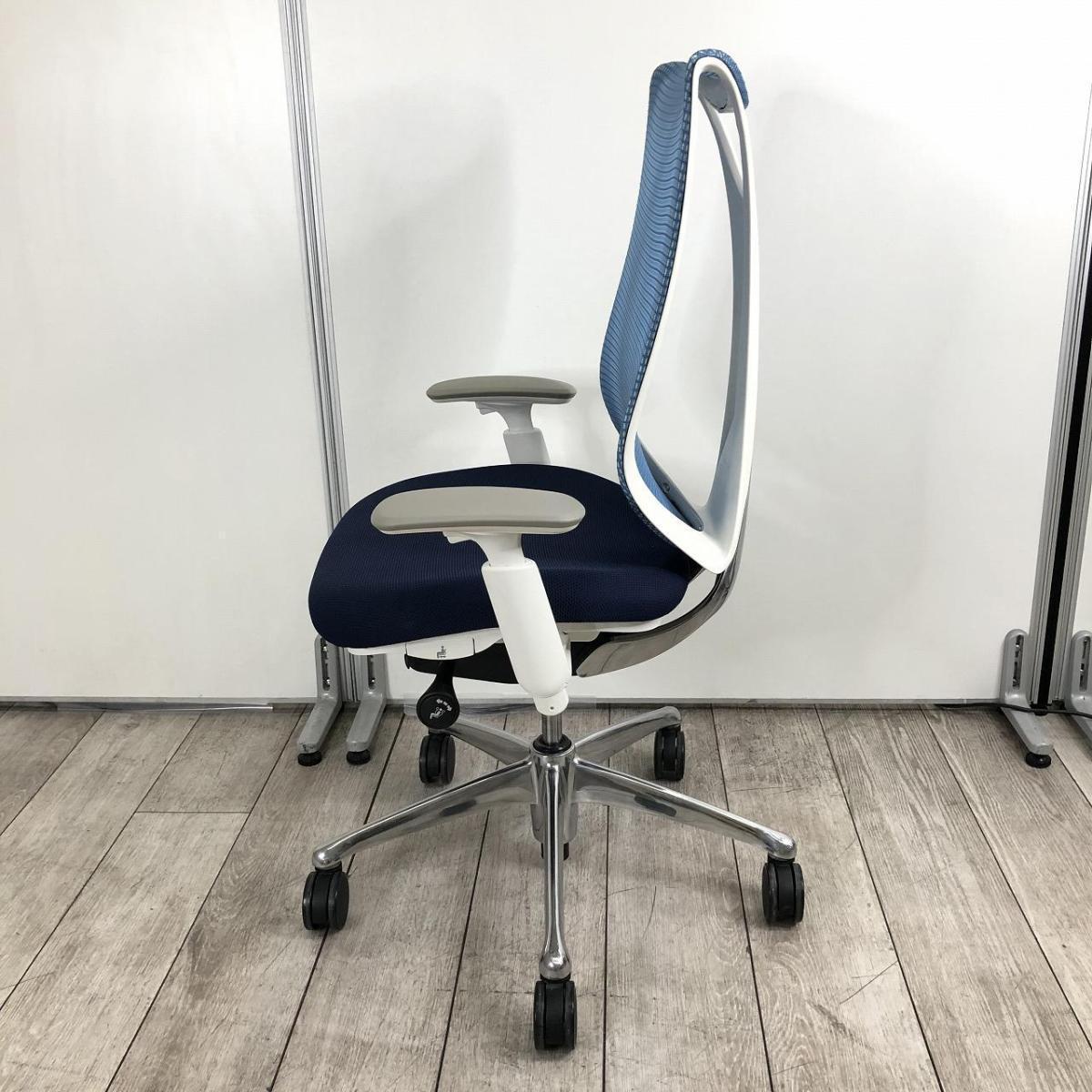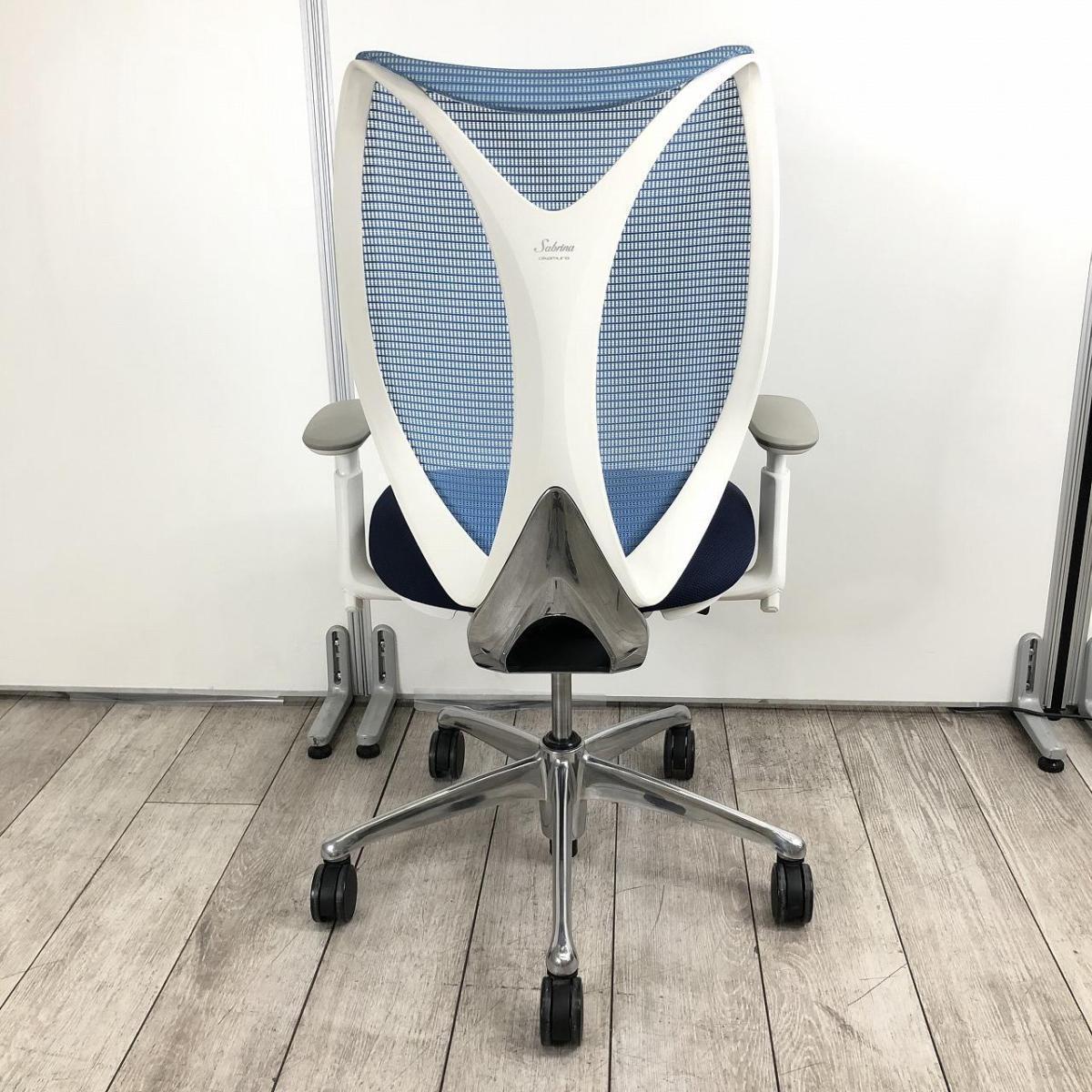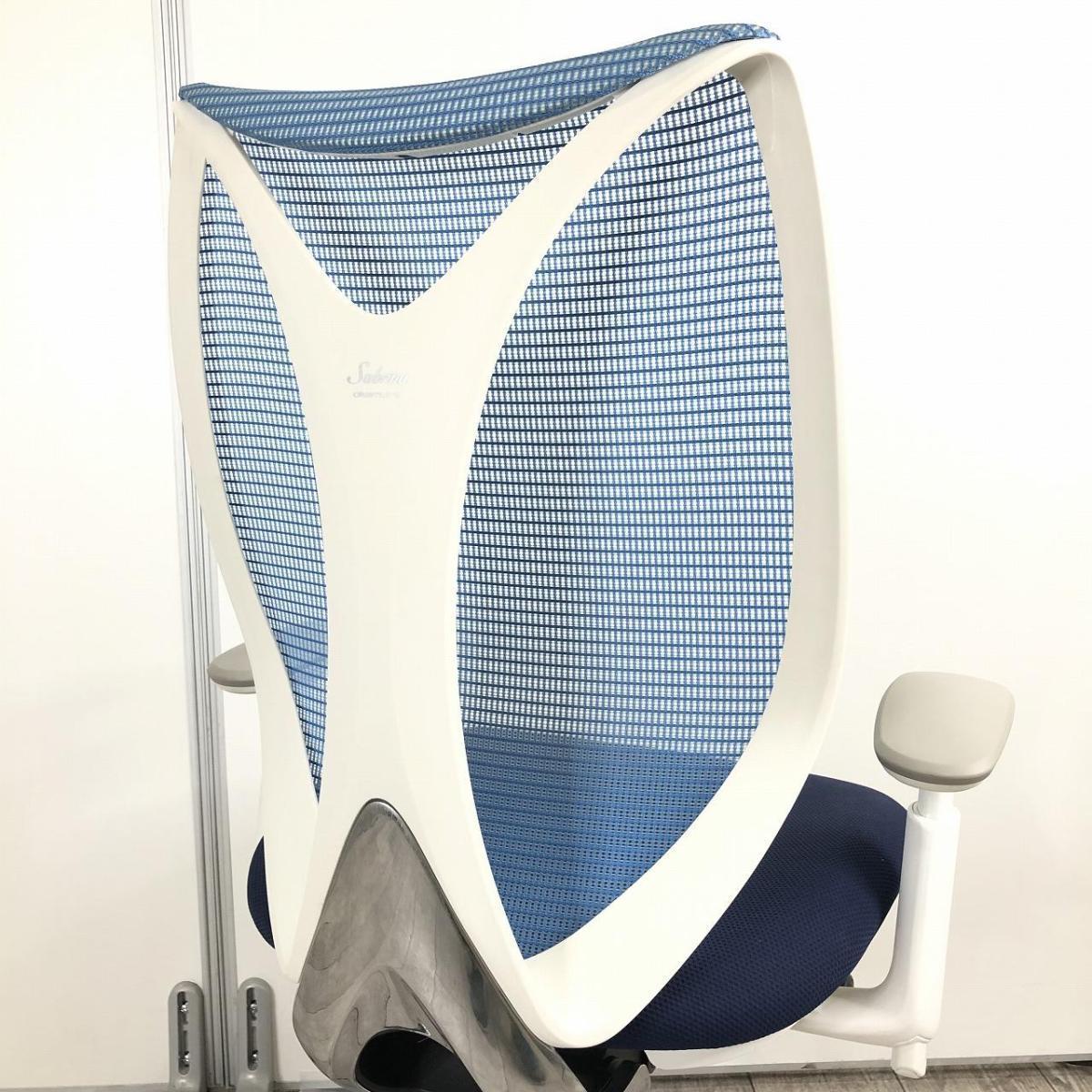【前傾チルト付!流れるような美しいフォルムの最高級メッシュチェア!】■オカムラ(okamura)製 Sabrina(サブリナ) ハイバック 肘付き ■可動肘 ■背面メッシュ:アクアブルー 座面:ブルー ホワイトフレーム 【座面にダメージがあるためお値下げ商品】- 品川・三田店
