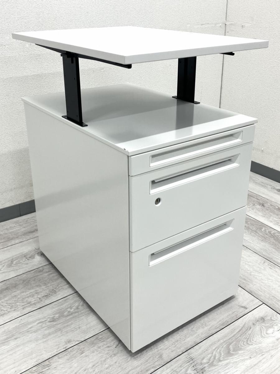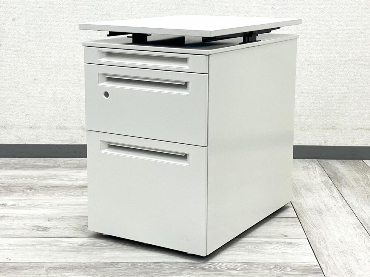 オカムラのアドバンスシリーズ昇降天板付きワゴンは、デスク周りの収納力と作業性を高める実用的な一台です。