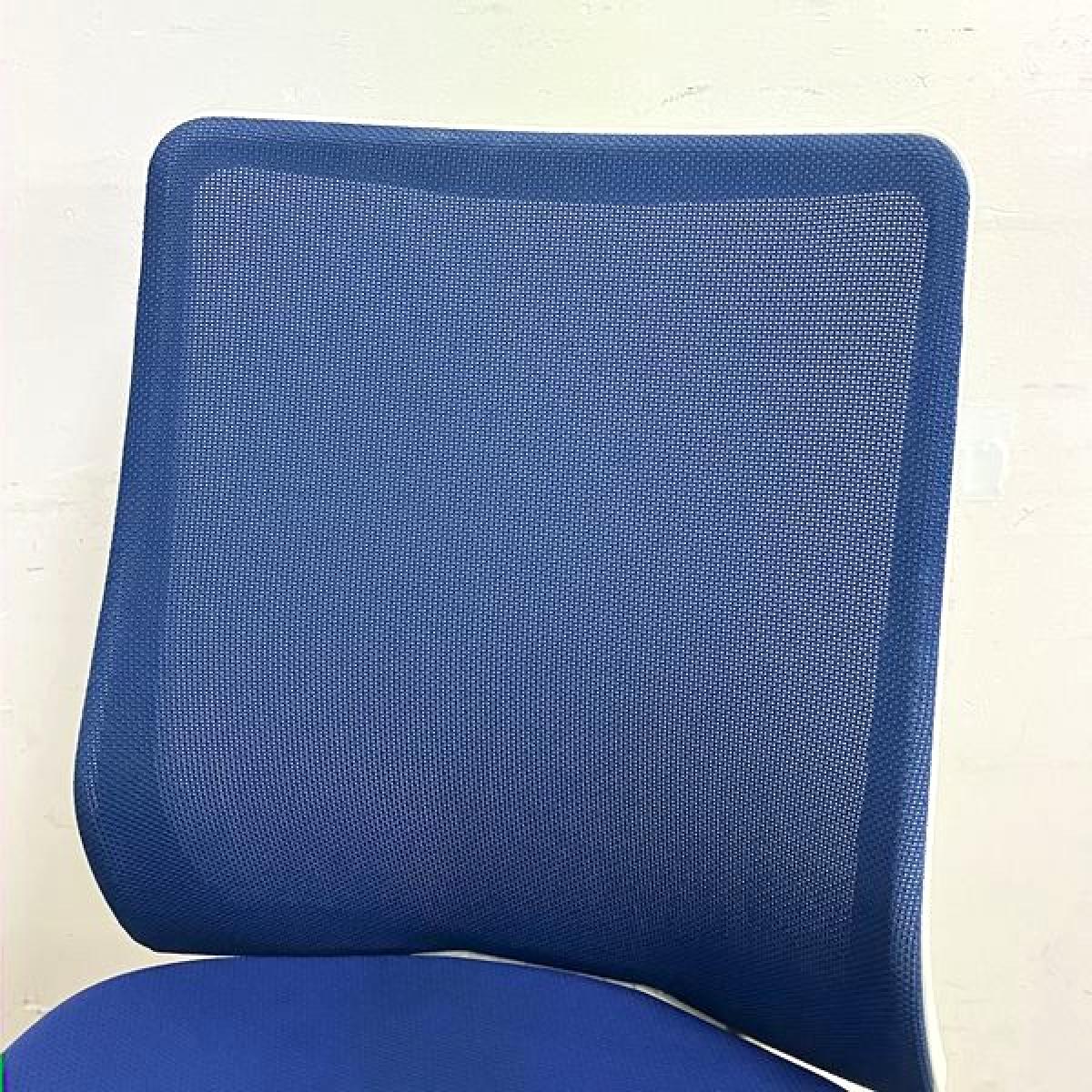 オカムラ製 フルーエント ミディアムブルー ホワイトフレーム 肘付き ローバック 背面メッシュ デザインアーム※固定肘 樹脂脚 腰まわりをしっかりホールド! 長時間作業も快適フィット! 肘無しローバックチェア!!