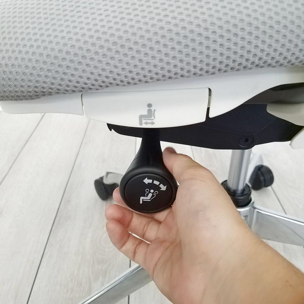 - 座面右下のダイヤル操作で、リクライニングの強弱調整が行えます。これまでのダイヤル式よりも、少ない回転数で、最弱?最強の調整が可能です。