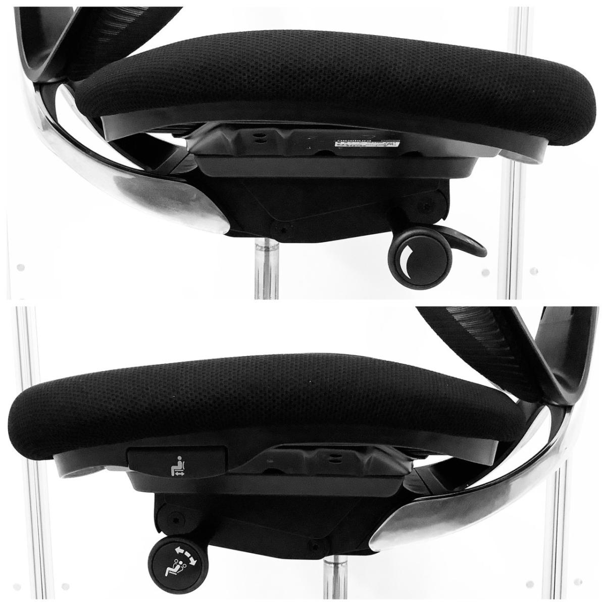 - 座面右下のレバーをスライドさせる「クイックスライドオペレーション」で、リクライニング反力を調整できます。強さの状態が視覚的にわかるため、直感的に操作がおこなえます。