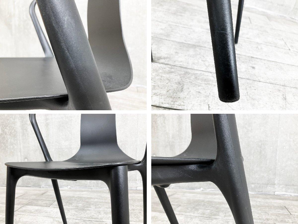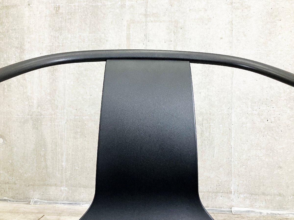 この椅子の最大の特徴はシートシェルです。シートシェルは、ベルヴィルチェアのアイデンティティとなる部分であり、素材や色に応じてイメージが変化します。スレンダーな黒のフレームは、脚や背面に向かって書道の線を思わせるようなラインを描いています。一方シートシェルは、広めの座面が背もたれにかけて細くなっていき、非常に薄いシェルを支えています。