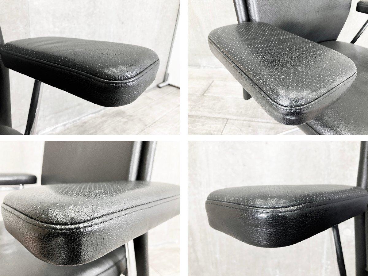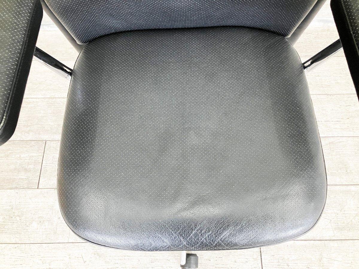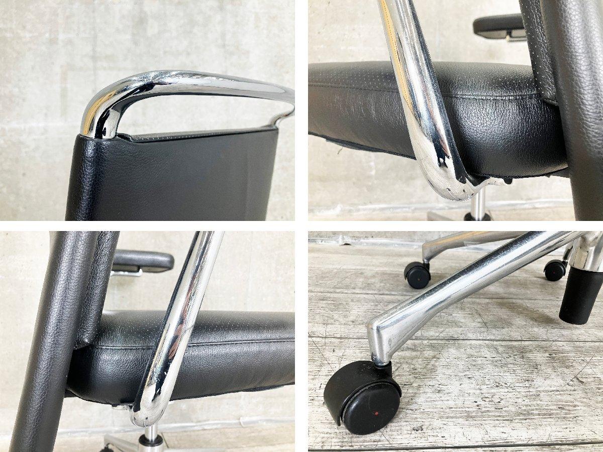 レザー張りの背・座がもたらす上質な座り心地と、クロームフレームの美しいラインが特徴のモデル。ミッドセンチュリーの空気を感じさせる端正な佇まいで、ワークスペースに落ち着いた存在感を与えます。