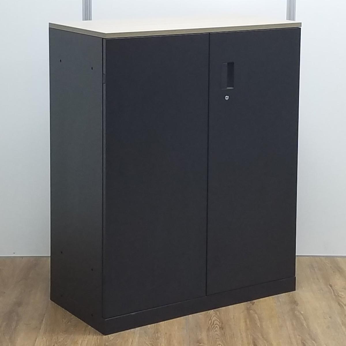 【書類の収納スペースを増やしたい方に!収納力抜群な観音開きタイプのキャビネット】■イトーキ製 (ITOKI)製 エスキャビネット(eS) 両開き ローキャビネット H1120㎜ ■ブラック /天板:木目調ナチュラル ■シリンダー錠 【フラットで美しい!】
