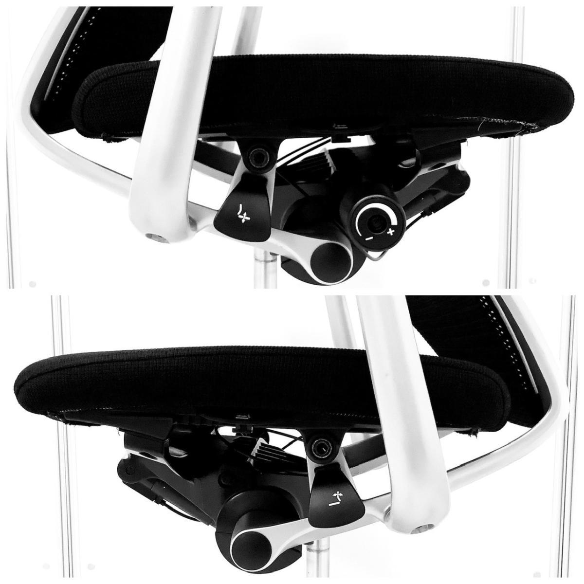 両手を自然に下ろした位置にあるレバーにて、座面の前後スライド調整(前後50mm)が可能です。