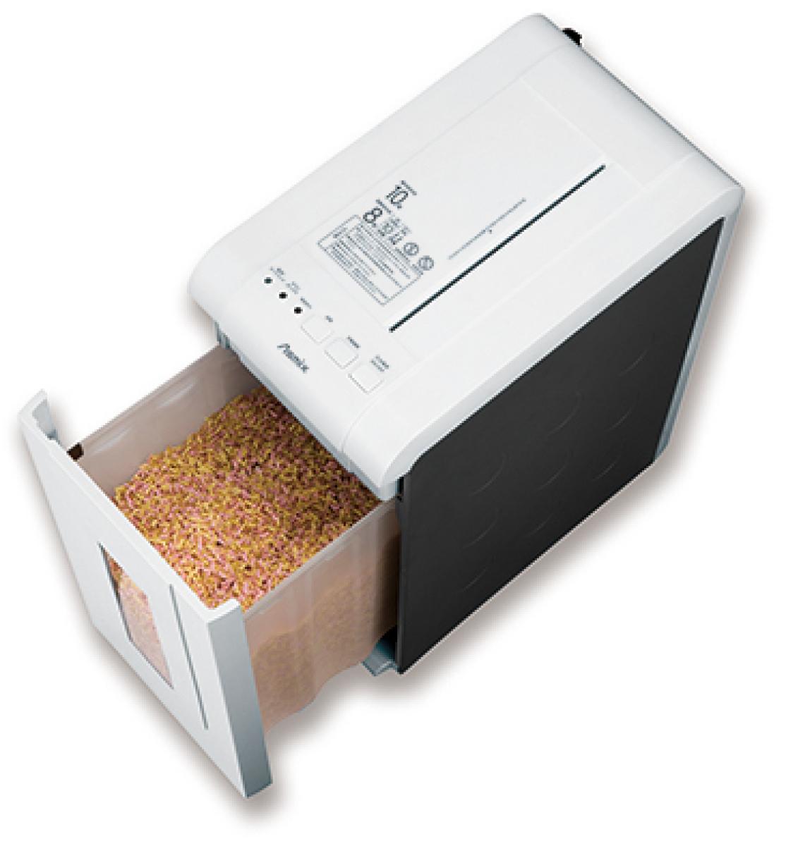 情報を復元不可能なレベルで細かく細断方式です。個人情報の処理に最適です。