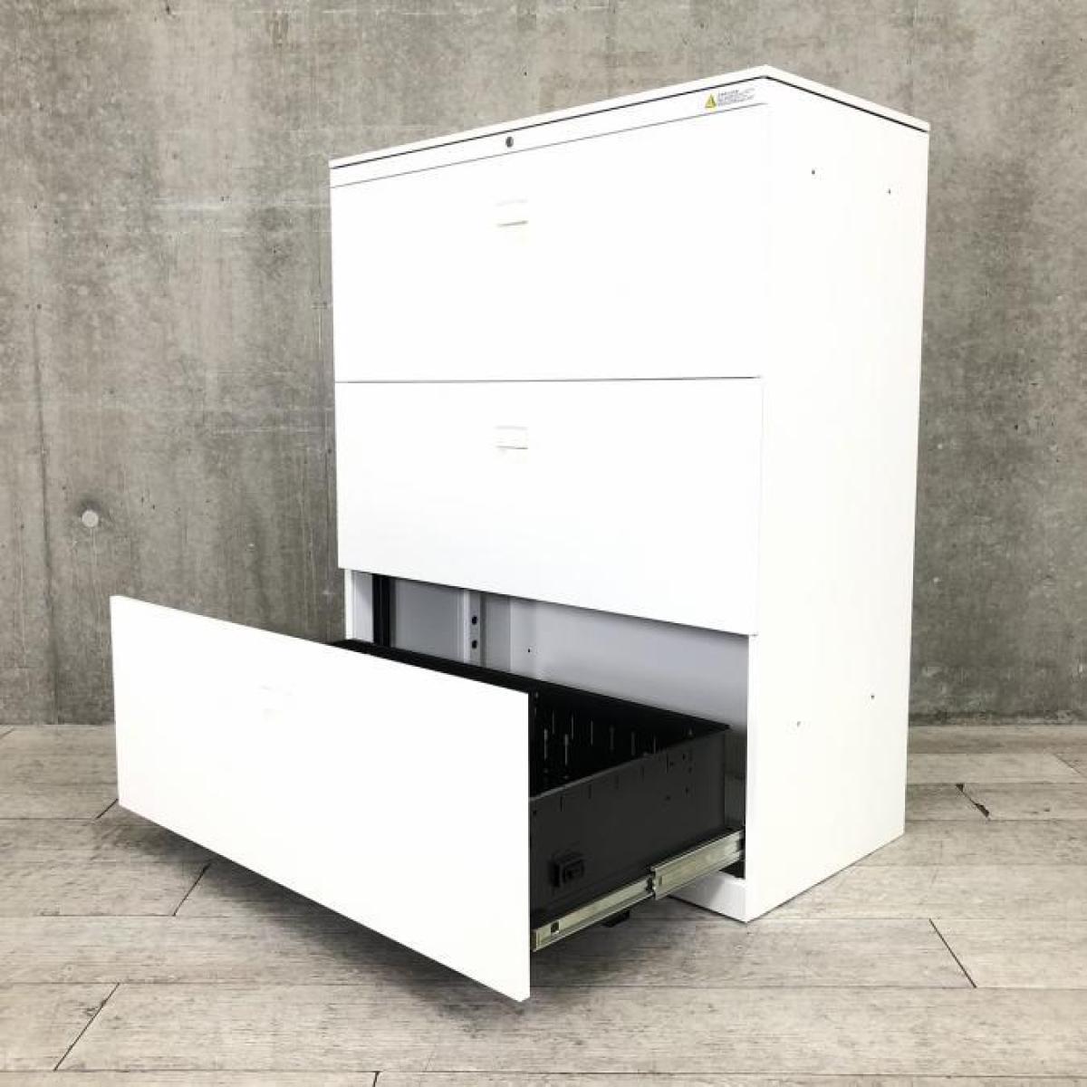 【大きく開いて収納物が見やすく、収納力も抜群!どの空間でも使いやすいホワイトカラー!】■オカムラ(okamura)製 SAデュオラインシリーズ 3段ラテラル ローキャビネット W900×D450㎜ ■シリンダー錠 ■ホワイト ■天板付- つくば店