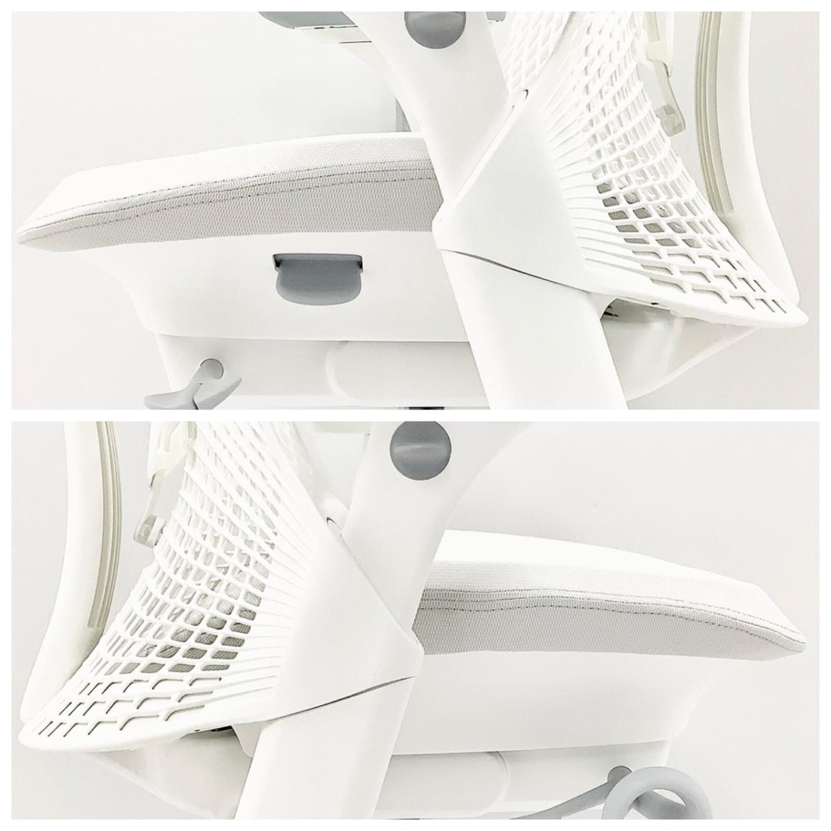 - 座ったまま、レバー操作一つで、簡単に座面を前傾できます。前傾姿勢を取ることが多いデスクワーカーに最適です。