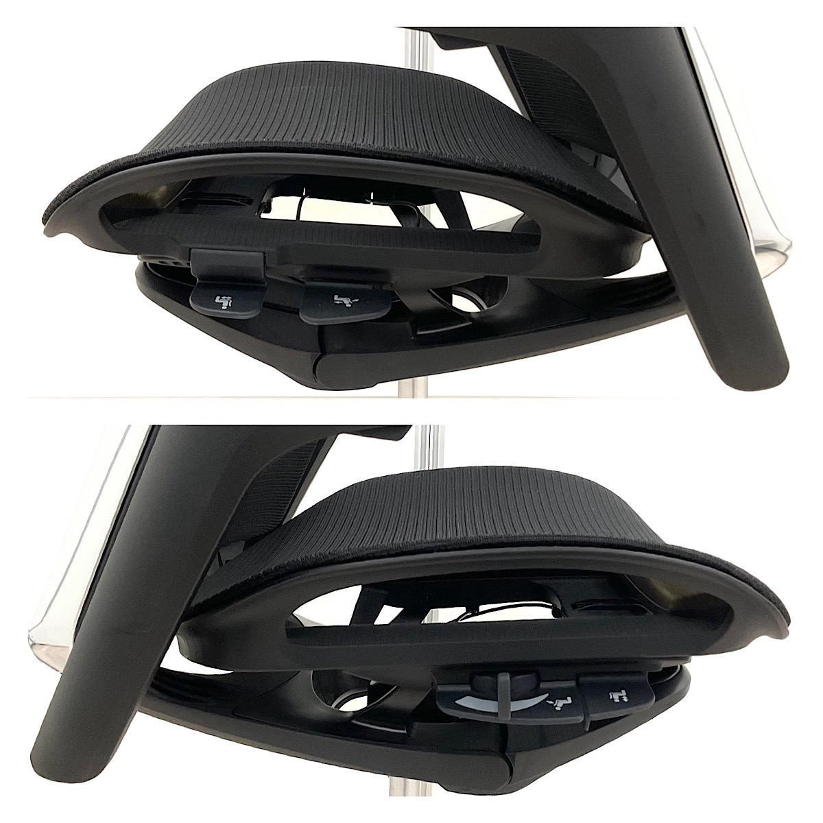 操作レバーを座面のすぐ下に集約し、座ったままの自然な姿勢で調節が可能です。(リクライニング固定/解除/強弱調節)