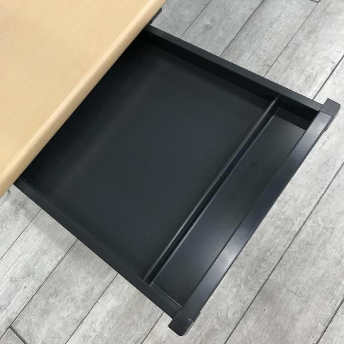 日常の執務に必要なステーショナリーやメモ帳などが収まる引出し付です。