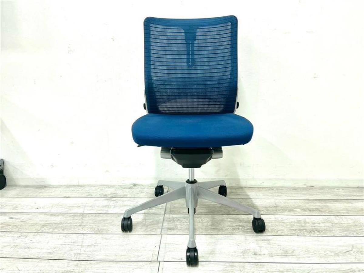 【在庫入替セール】オカムラ コーラル 肘無しミドルバック メッシュタイプ 張地:ミディアムブルー シルバーフレーム ランバーサポート&コートハンガー付き
