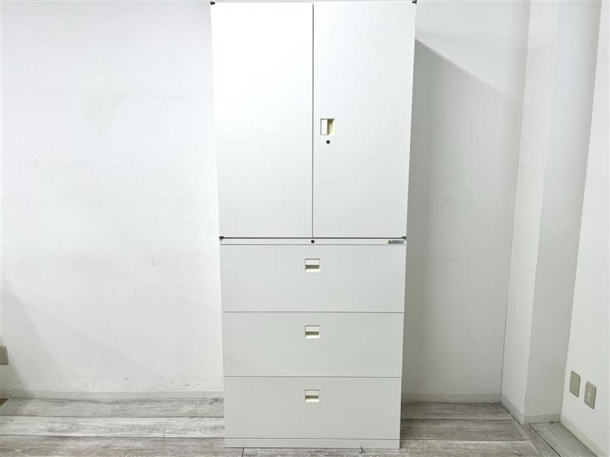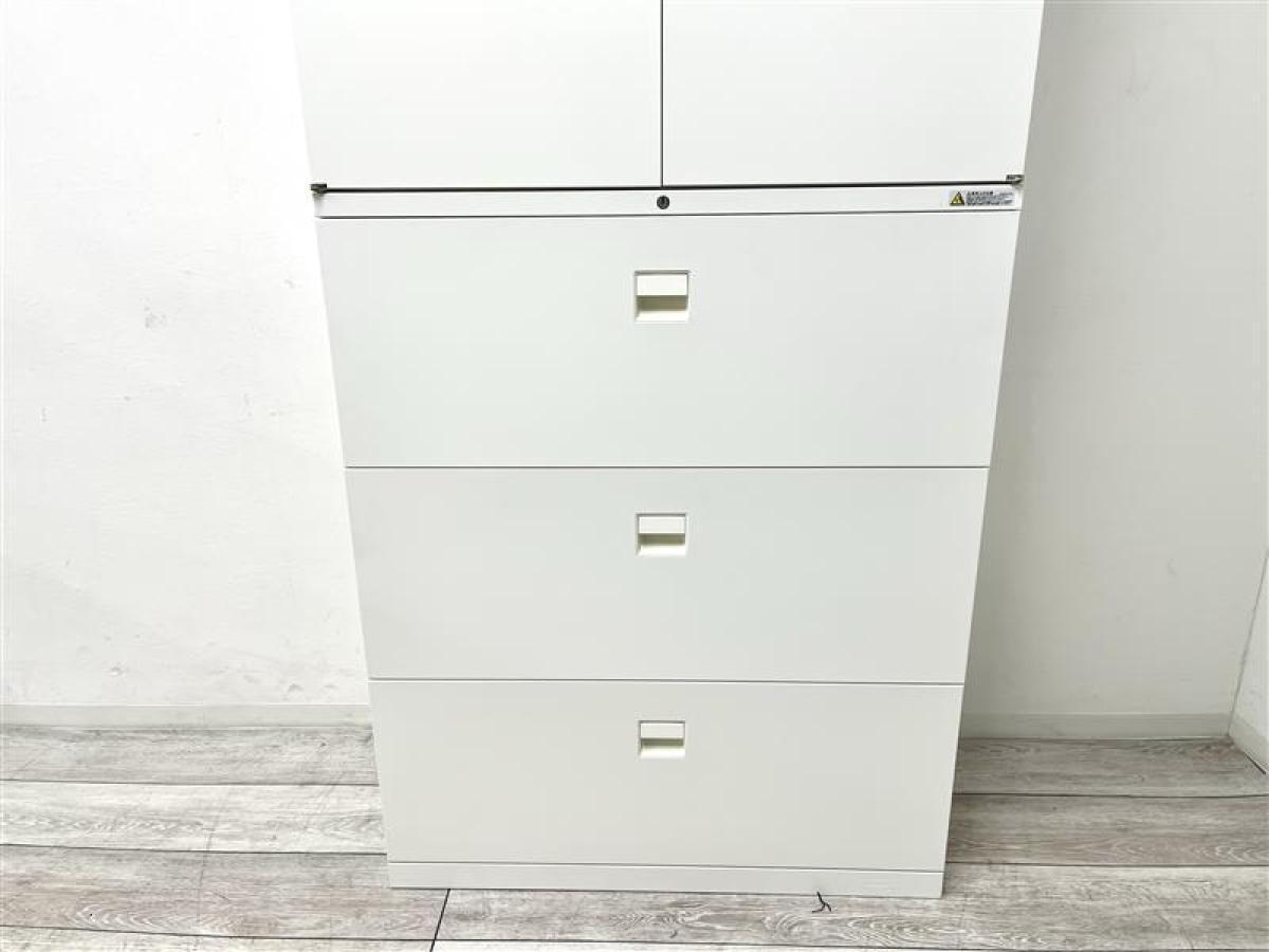 【省スペースに大量収納できます!】■オカムラ製 上下書庫セット(両開き+3段ラテラル) W900/D450/H2150mm ホワイト ■縦空間を有効活用!オフィス書類をスッキリ整理!- 川崎店