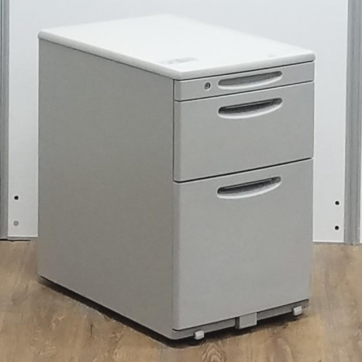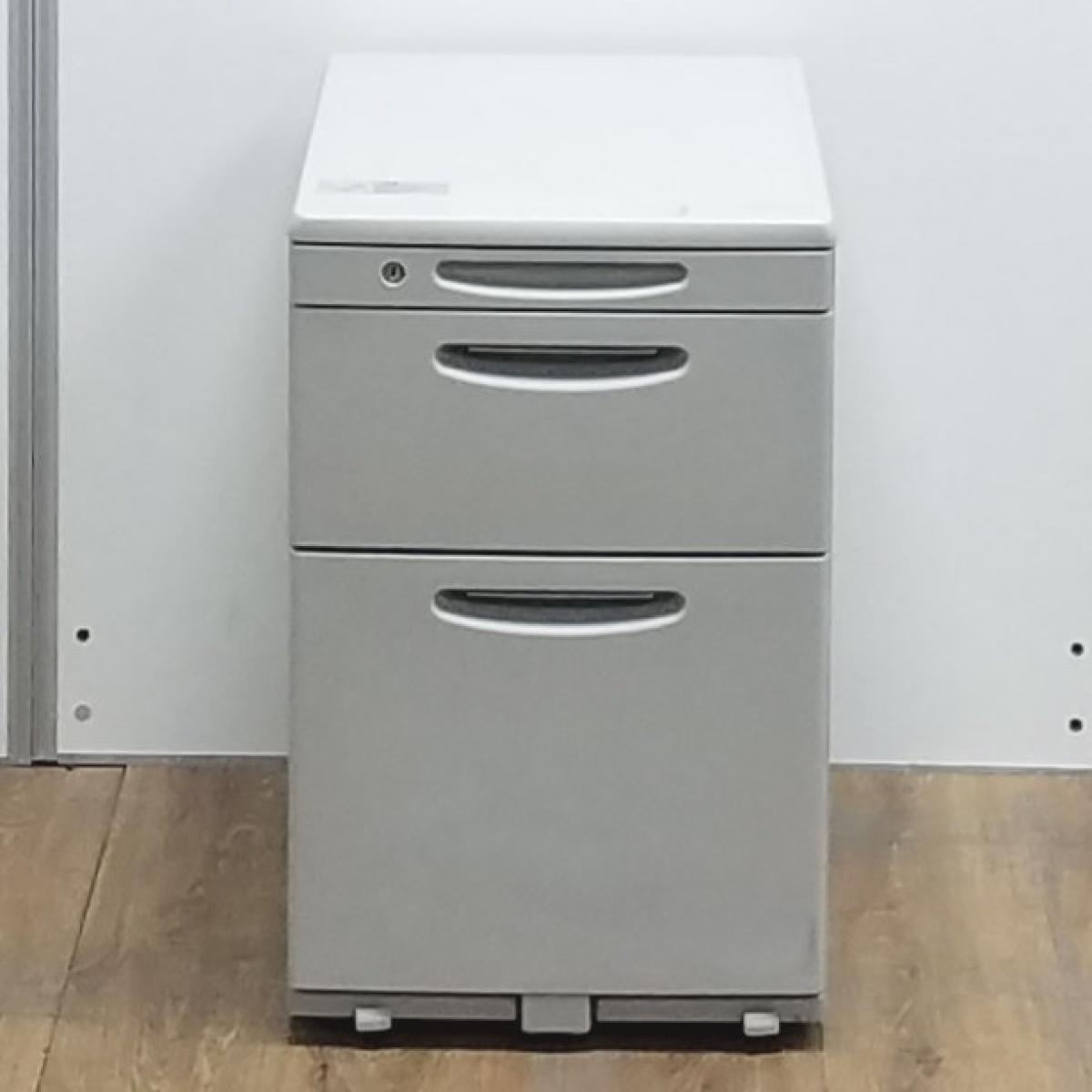 【商品入替のため、残り1台限り】オカムラ製 SD ライトグレー H610サイズ シリンダー錠 天板の把手とキャスターで移動がらくらく! シンプルでスタンダードな3段ワゴン! デスクインワゴン 3段ワゴン