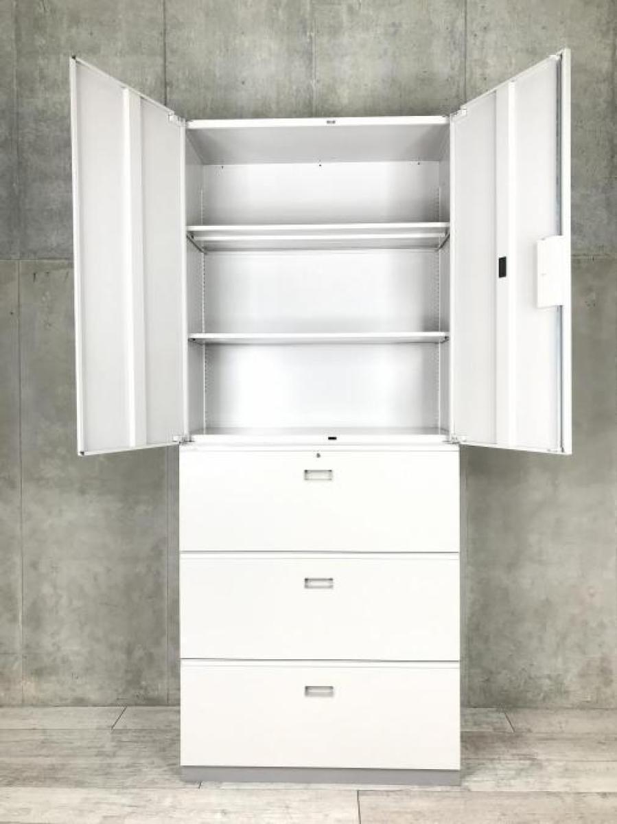 【在庫お探しいたします!/予約依頼商品】イトーキ製のハイキャビネット(両開き書庫+3段ラテラル書庫)【シンラインシリーズ/ニューグレー色】 *良品を格安で!「オフィスバスターズ福岡南店」は、福岡を拠点として、全国へ中古オフィス用品・オフィス家具を提供しております